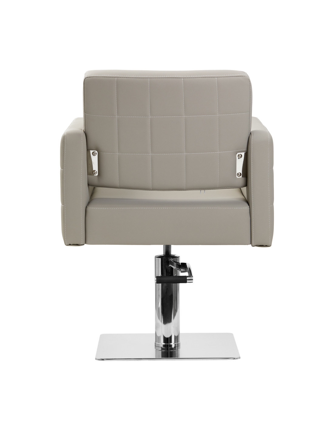 A solid, flat, square base ensures stability during use. The smooth surface with a mirror finish gives the element an elegant look and makes it easy to keep clean. A comfortable seat filled with durable foam ensures high comfort of use, even during many hours of treatments. Upholstered with synthetic leather with decorative stitching armrests are a visually interesting element, and more importantly, they allow the customer's shoulders to be positioned correctly. This means that he does not bury his head in his shoulders or slouch – this clearly makes it easier to perform precise procedures, including haircuts. Equipping the chair with a full rotation mechanism makes the hairdresser's work more effective and comfortable.