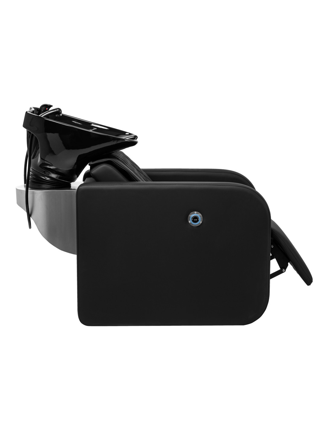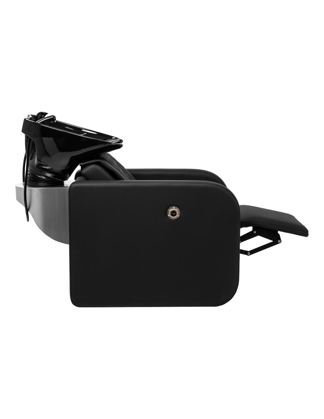 The depth of the ceramic bowl of the basin bowl in shades of black allows for comfortable and effective performance of a wide range of hairdressing services, preventing excessive splashing of water and products used during the treatment. The material used makes the washbasin durable, resistant to discolouration and scratches, and very easy to keep clean. The appropriately profiled collar and inclined backrest provide support and comfort while washing hair, and thanks to the comfortable plastic overlay in shades of black, the customer will not feel any discomfort associated with the cold ceramic surface.