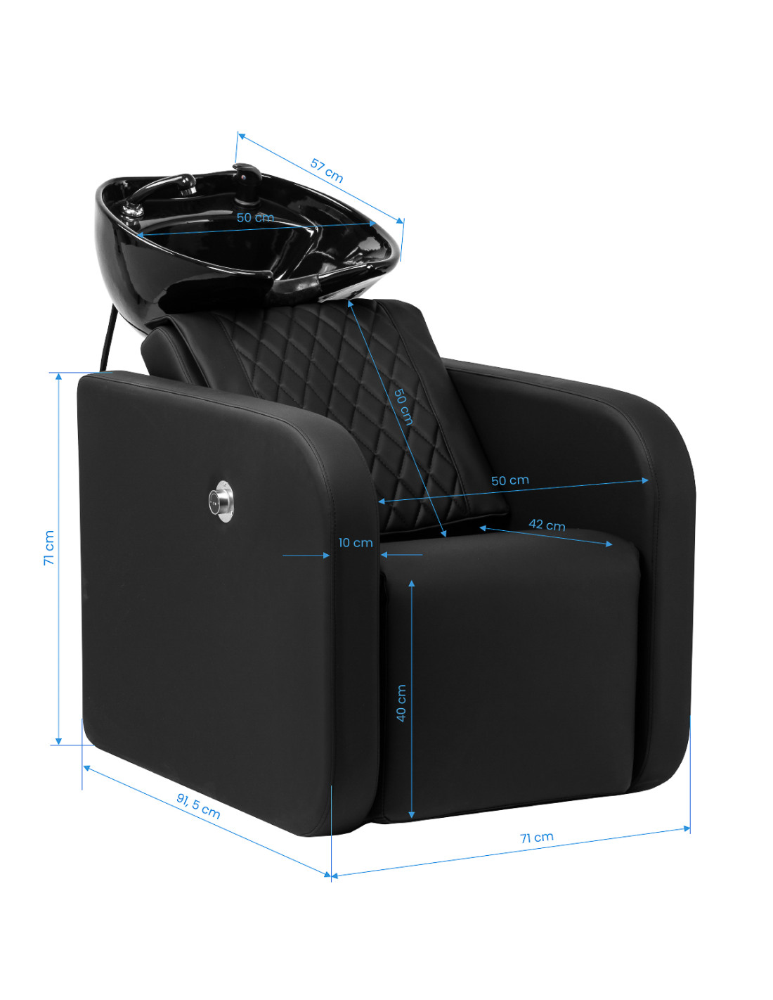 The Gabbiano Sylvia Salon washbasin unit was created with maximum comfort for both the client and the stylist in mind – it is ideal for care treatments, colouring or longer procedures. The simple, geometric form and clearly defined lines of the seat and armrests give it a modern, elegant character. The backrest set at an optimal angle provides adequate support for the spine, and stylish stitching adds aesthetics to the whole. The profiled seat is filled with durable foam, while the upholstered armrests allow for the correct positioning of the shoulders and arms. The cover made of high-quality synthetic leather in shades of black is distinguished by its durability and ease of cleaning. The wash unit looks elegant and modern, emphasizing the style of the salon.