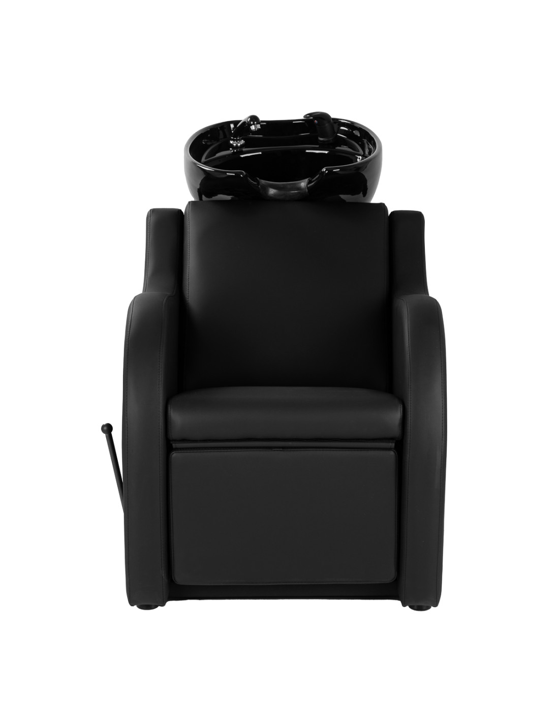 A contoured chair with durable foam padding provides adequate support for the lumbar region, which translates into high comfort of use. Upholstered armrests allow the client's shoulders to be positioned correctly, supporting a comfortable position during the treatment. Soft-to-the-touch synthetic leather in shades of black is distinguished by its durability, ease of cleaning and resistance to moisture. The modern form of the wash unit adds a distinctive style to the interior. The set includes full fittings in black – a faucet, a shower head and dedicated hoses – creating a ready set for everyday work.