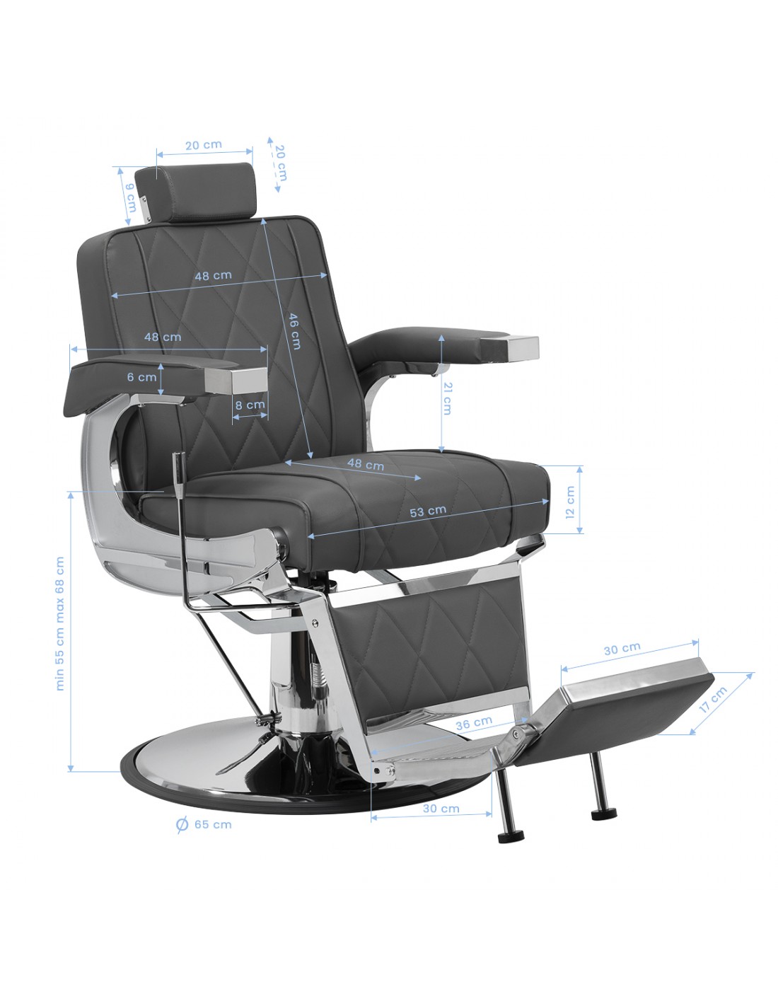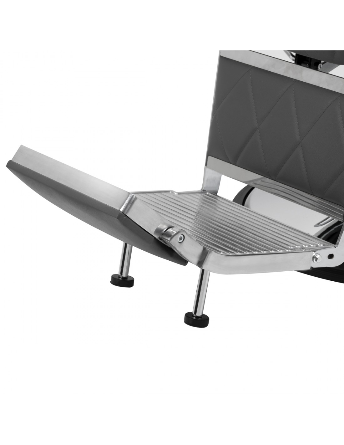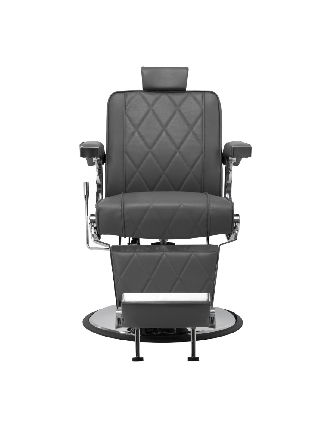 The chair's solid round base construction ensures stability and excellent user comfort. The seat filling, made of deformation-resistant foam, and the upholstery crafted from soft-touch synthetic leather with a matte finish ensure long-lasting durability and comfort during prolonged use. Stylish stitching on the upholstery adds character, evoking automotive design inspirations that enhance its elegant appearance. This feature also makes the chair moisture-resistant, durable, and easy to clean. The upholstery in grey tones gives the chair a unique character, and its minimalist style allows it to blend seamlessly with the decor of any barbershop.