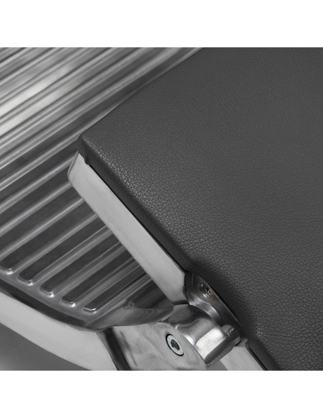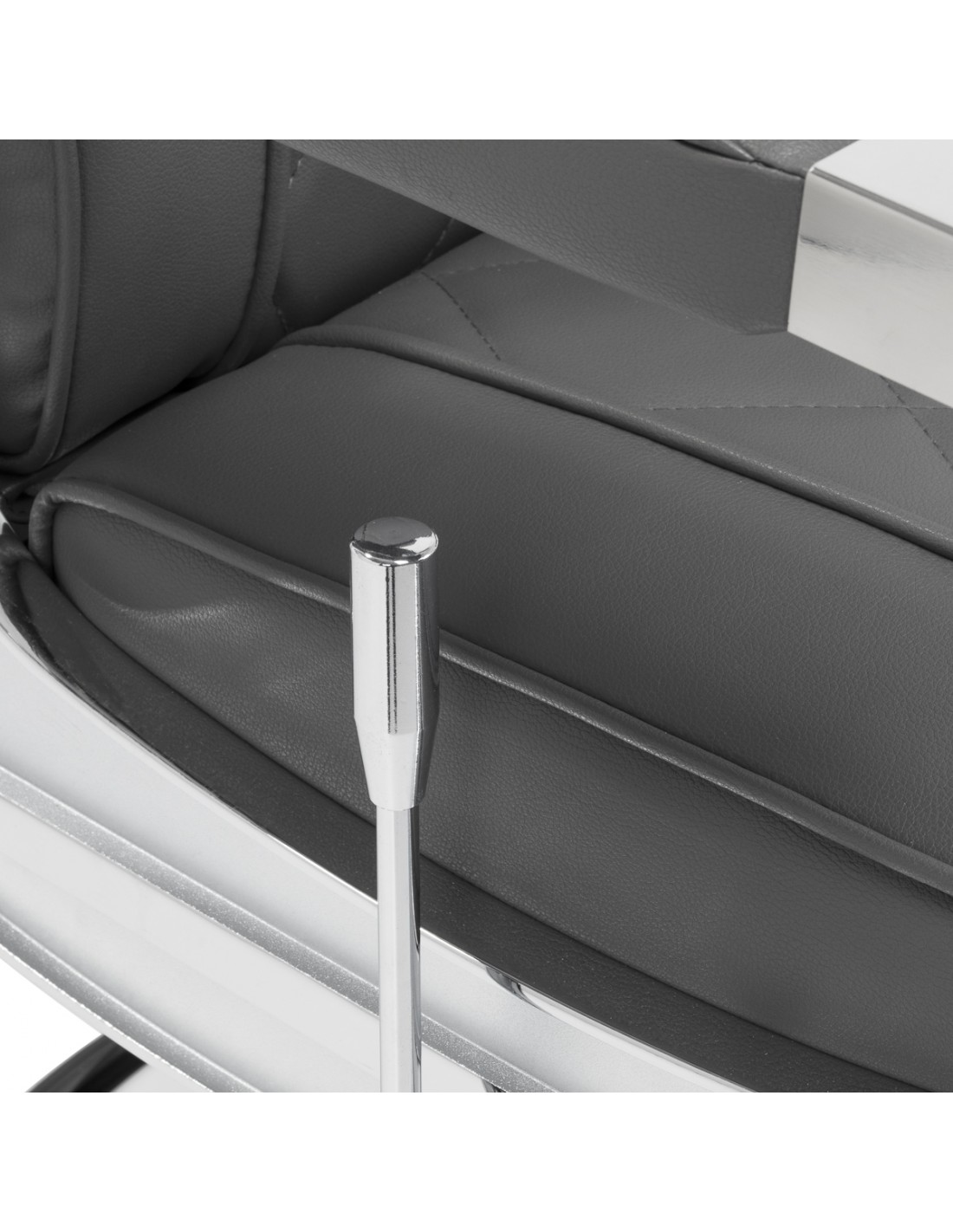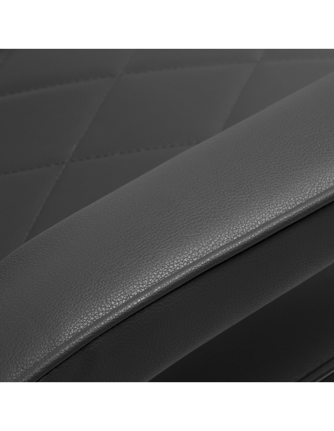 The chair's solid round base construction ensures stability and excellent user comfort. The seat filling, made of deformation-resistant foam, and the upholstery crafted from soft-touch synthetic leather with a matte finish ensure long-lasting durability and comfort during prolonged use. Stylish stitching on the upholstery adds character, evoking automotive design inspirations that enhance its elegant appearance. This feature also makes the chair moisture-resistant, durable, and easy to clean. The upholstery in grey tones gives the chair a unique character, and its minimalist style allows it to blend seamlessly with the decor of any barbershop.
