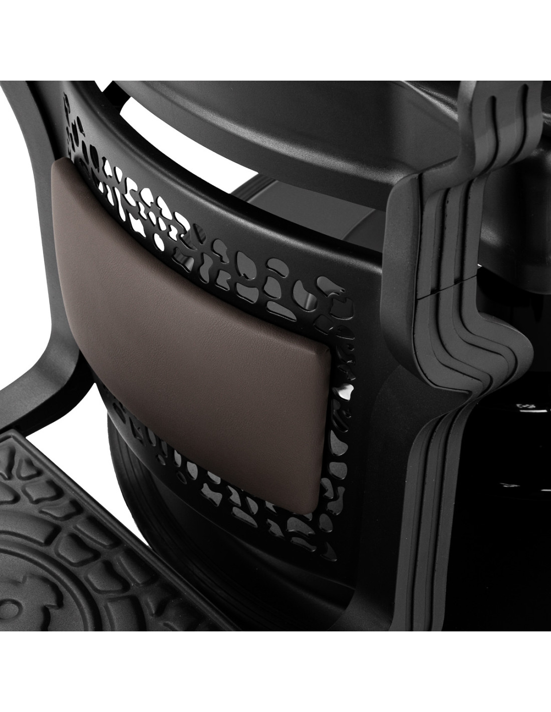 A solid base construction ensures stability and high comfort of use. The seat filling made of durable, deformation-resistant foam and the upholstery made of pleasant-to-touch synthetic leather with a matte finish ensure long-term durability and comfortable use of the furniture. The materials used also make the equipment moisture-resistant, durable, and easy to clean. The cover in shades of brown along with the decorated footrest, gives it a unique character. The chair, with its distinctive design referencing vintage style, fits perfectly into the atmosphere of barbershops, enhancing their unique ambiance.
