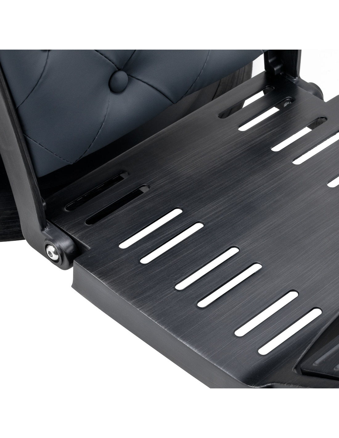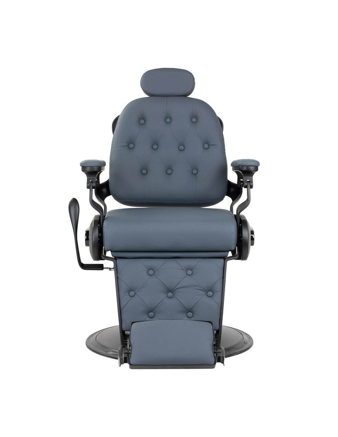 The stable construction of the base with elements in shades of black ensures high comfort of use. Filling with durable, deformation-resistant foam and upholstery made of pleasant-to-touch synthetic leather ensure the durability of the furniture and its comfortable use for a long time. They also make the equipment resistant to moisture, durable and easy to clean. The covering in shades of graphite along with original quilting and decorative buttons give it a unique character. Designer decorative elements inspired by motorcycles, referring to the vintage style, will perfectly fit the atmosphere of barbershops, creating their amazing aura.