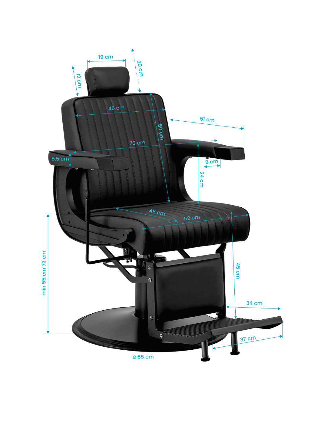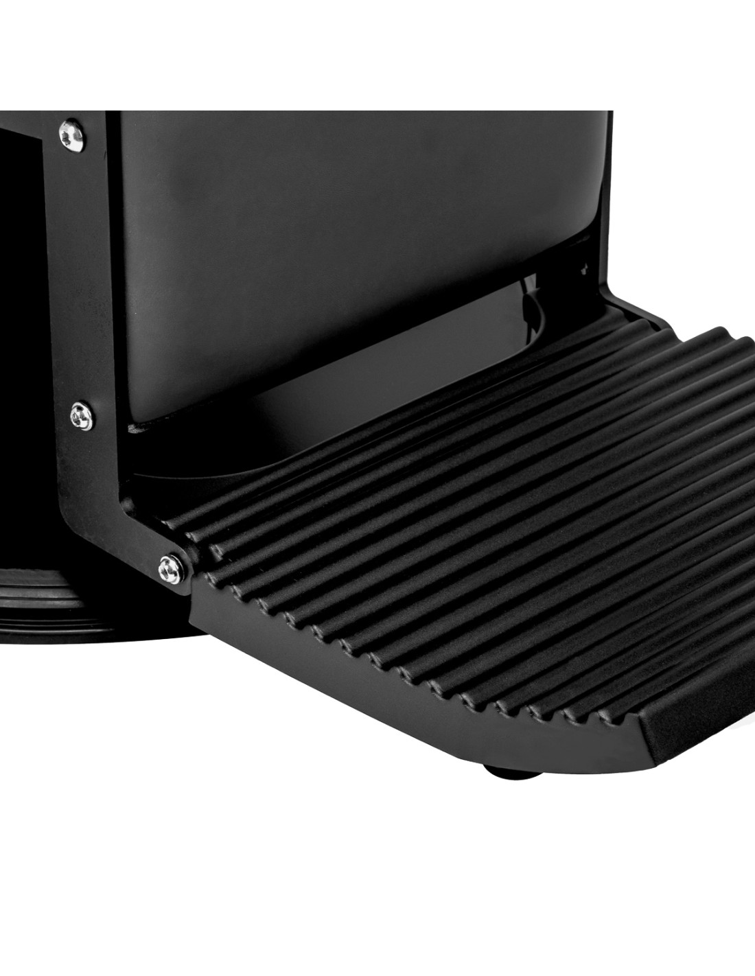 Sturdy base construction ensures stability and high comfort. The seat is filled with deformation-resistant foam and upholstered with soft, matt synthetic leather, combining durability with comfort. The materials used for the finish are moisture-resistant, durable and easy to clean, making the chair perfect for everyday use. Stylish stitching and upholstery in shades of black give it a unique character, blending perfectly with the décor of modern barbershops.