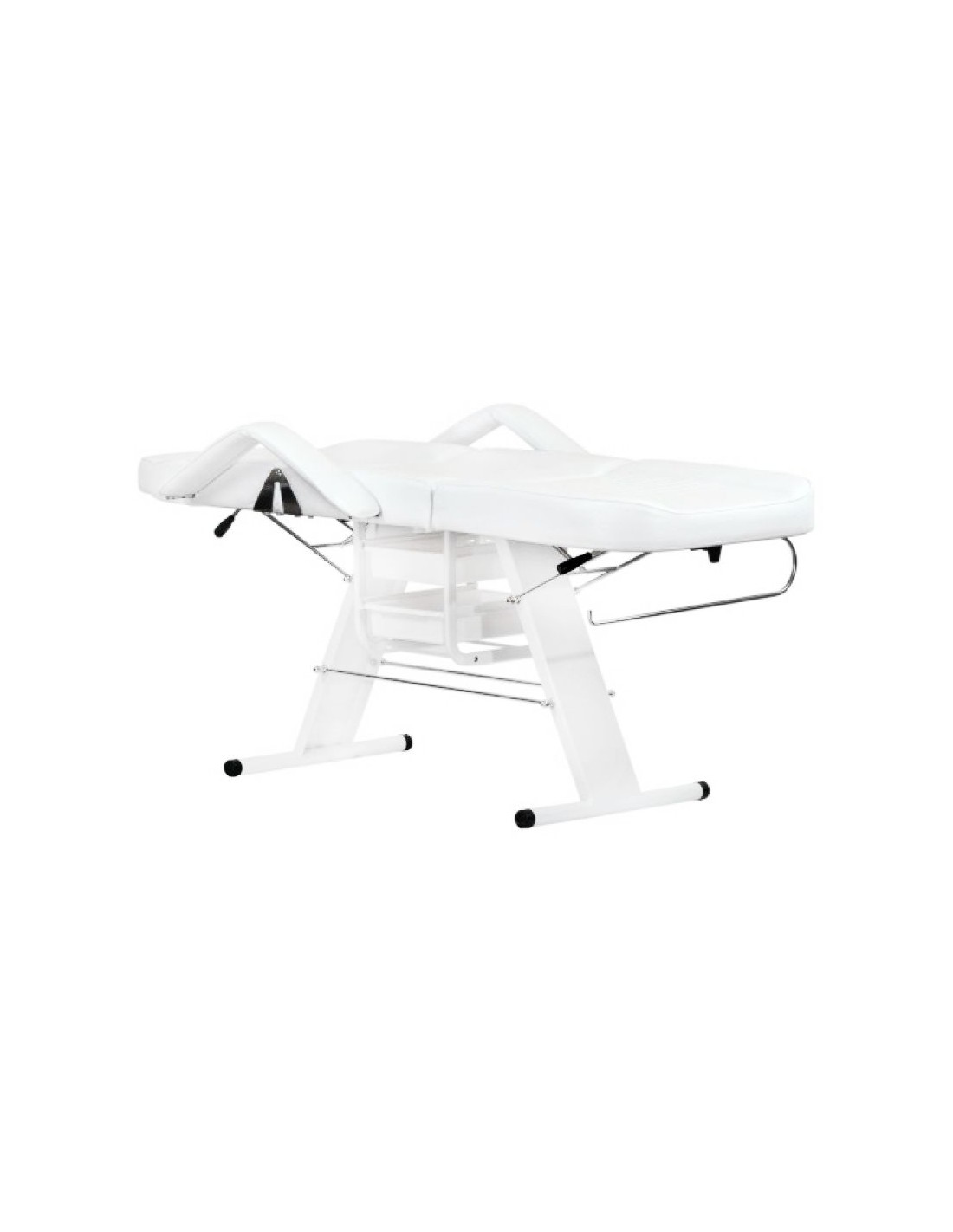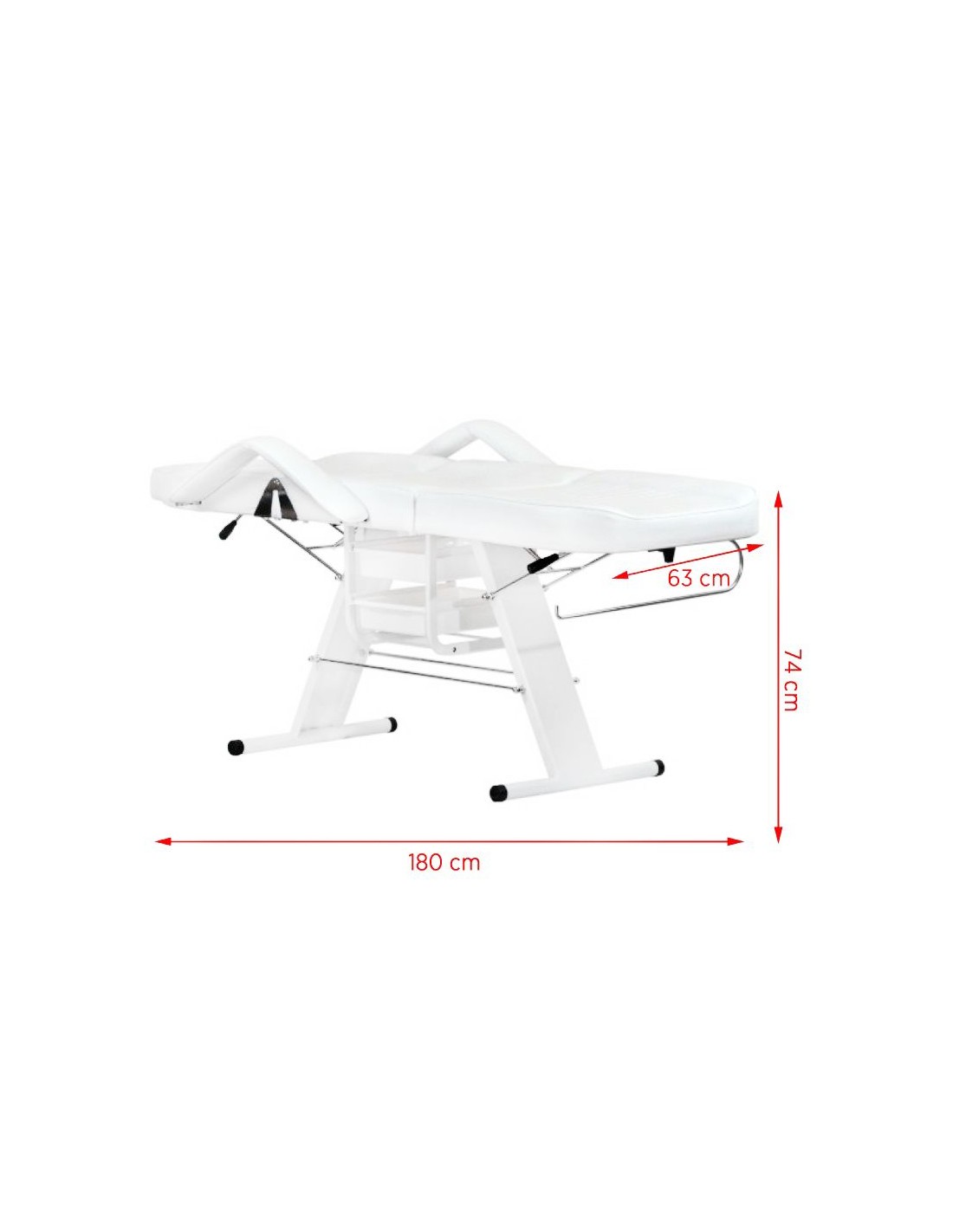 a chair with a hole in the headrest, with practical litter boxes, perfect for cosmetics and make-up. it has removable armrests and a plug in the headrest. Easily washable seat cover, made of eco-leather, meeting the stringent EU requirements, aesthetic, nickel-plated metal elements. under the armchair there is a bar for a disposable sheet, tablecloths or a towel. The armchair is available in white. The armchair consists of: