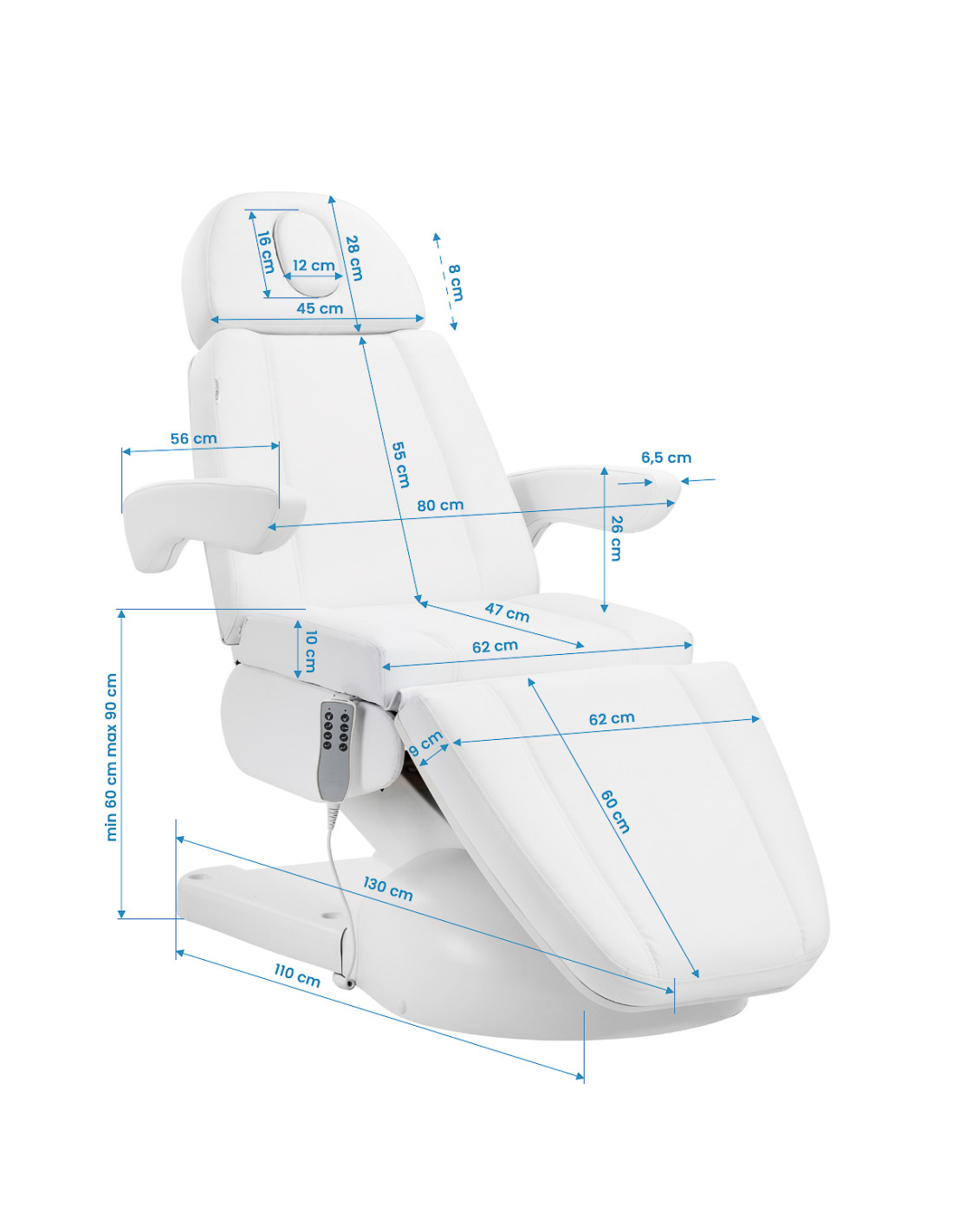 The Azzurro Lux electric Beauty bed is equipped with 4 actuators controlled by a wired remote control, which enables smooth and precise adjustment of individual elements. Intuitive operation and a wide range of adjustments make it easy to adapt the chair to the needs of both the client and the practitioner. It is distinguished by its stability and versatility of use, making it ideal for beauty, podiatry and aesthetic medicine surgeries.