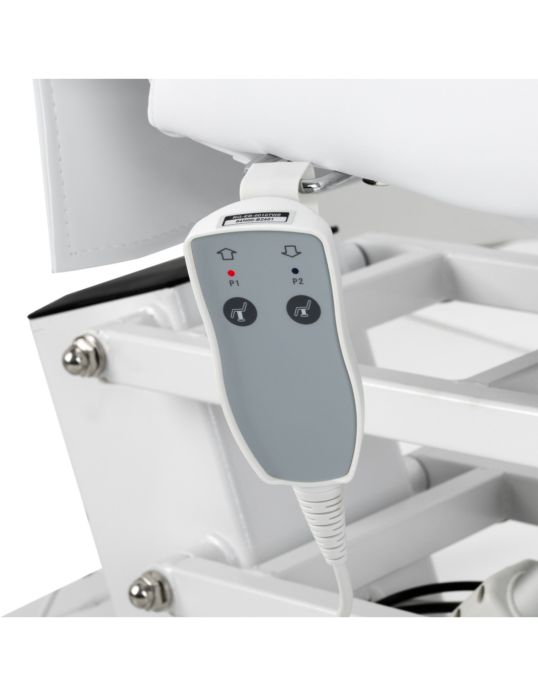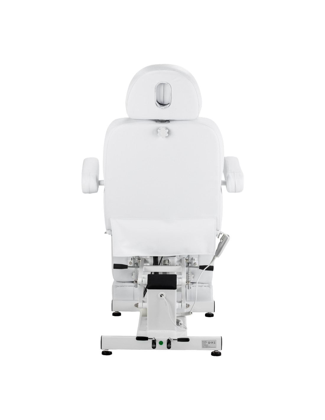 A wired remote control allows the seat height to be adjusted within a range of 63-85 cm. The adjustment range allows the position to be easily adjusted to the type of treatment being performed, taking into account the comfort of the client and the ergonomics of the specialist's work. For added convenience, the remote control can be hung on holders located on both sides of the seat.
