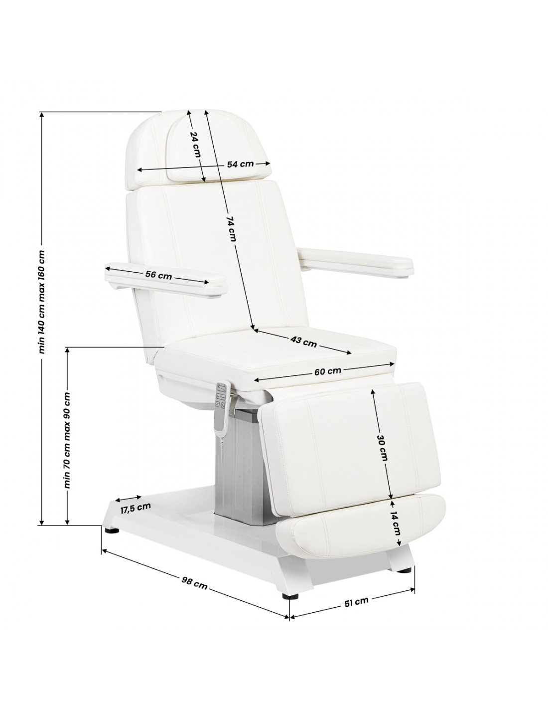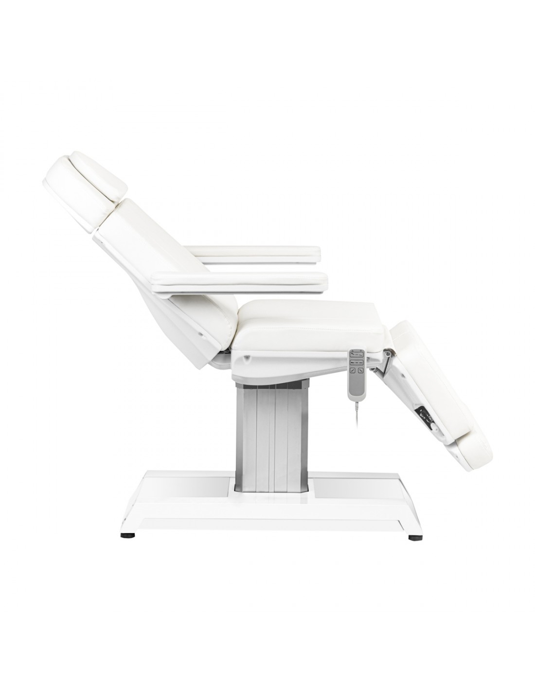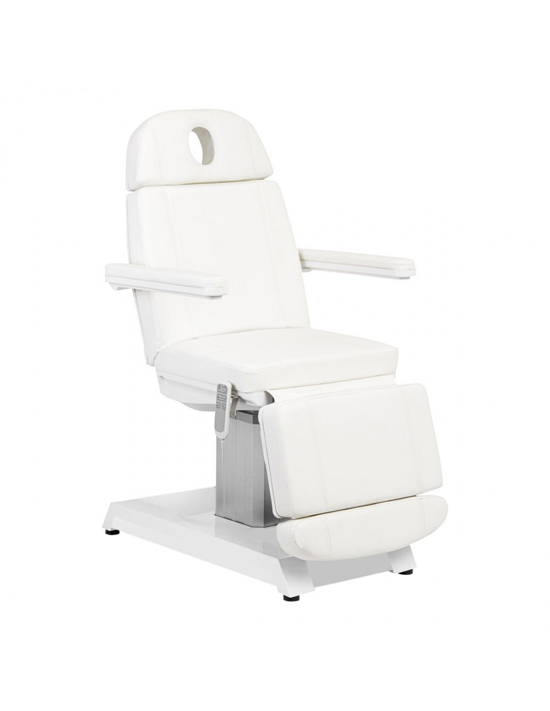 Professional electric Beauty bed EXPERT is ideal for beauty salons and SPA salons. Thanks to independent motors, it allows you to adjust the chair in 3 planes by means of a remote control, making it possible to carry out treatments for the face and body. Using the remote control, we can adjust the height of the chair, the inclination of the backrest, and set the seat to the cradle position. The footrest is independently adjustable with gas springs. An additional, interesting function is the multi-colored illumination of the armchair base.