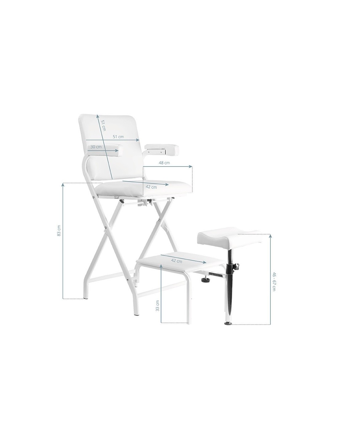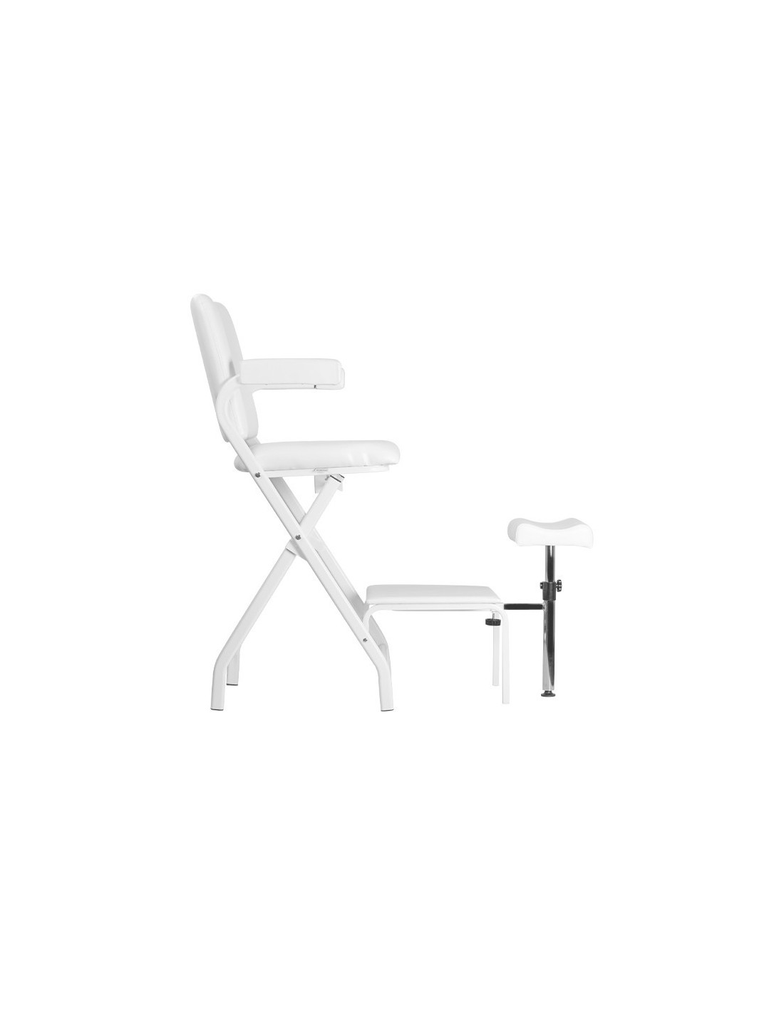 Folding chair dedicated to pedicures. The armchair is made of high-quality eco-leather, which is easy to clean and resistant to selected disinfectants. It has a manual footrest adjustment. After folding, it does not take up much space and can be hidden in a secluded place.