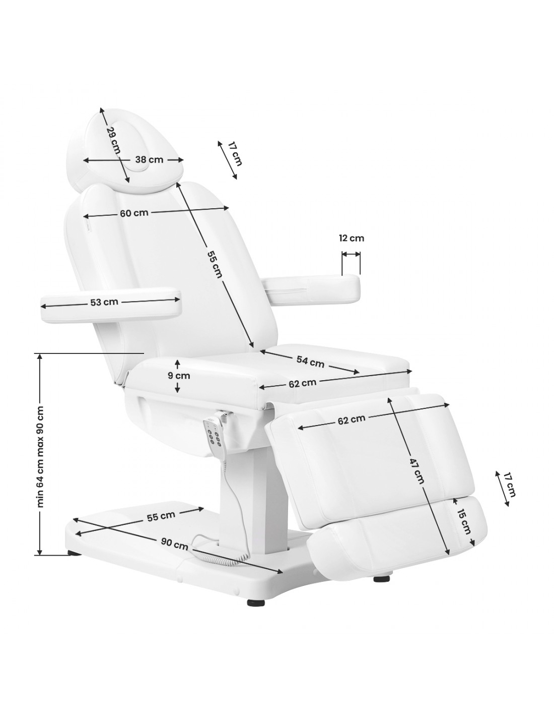 Using the remote control, the chair can be adjusted in three dimensions – it has electric adjustment of height, backrest and footrest. The seat can be adjusted to a height of 64 to 90 cm, and when fully extended, the chair reaches a length of over 2 meters. Additionally, the chair has an adjustable headrest and footrests (maximum extension of both elements by +/- 17 cm). These dimensions allow for easy use of the equipment by people of different heights and make it possible to be adapted to the needs of both the client and the person performing the procedure. The handle located on the right side of the seat allows you to hang the remote control so that it is always at hand.
