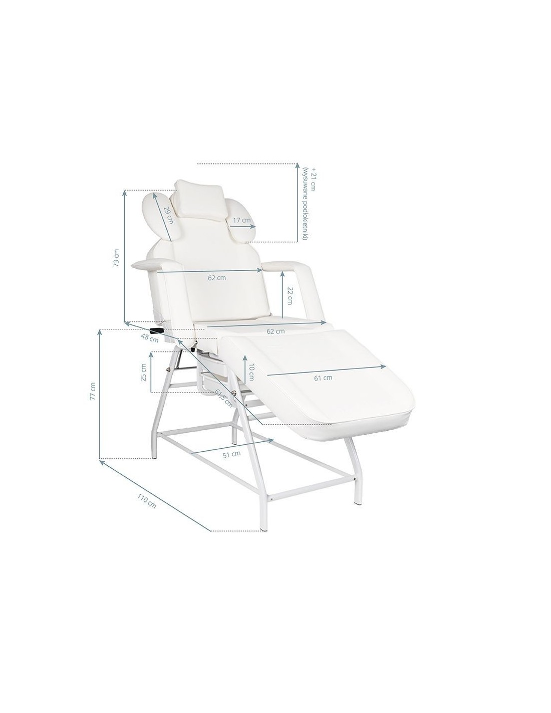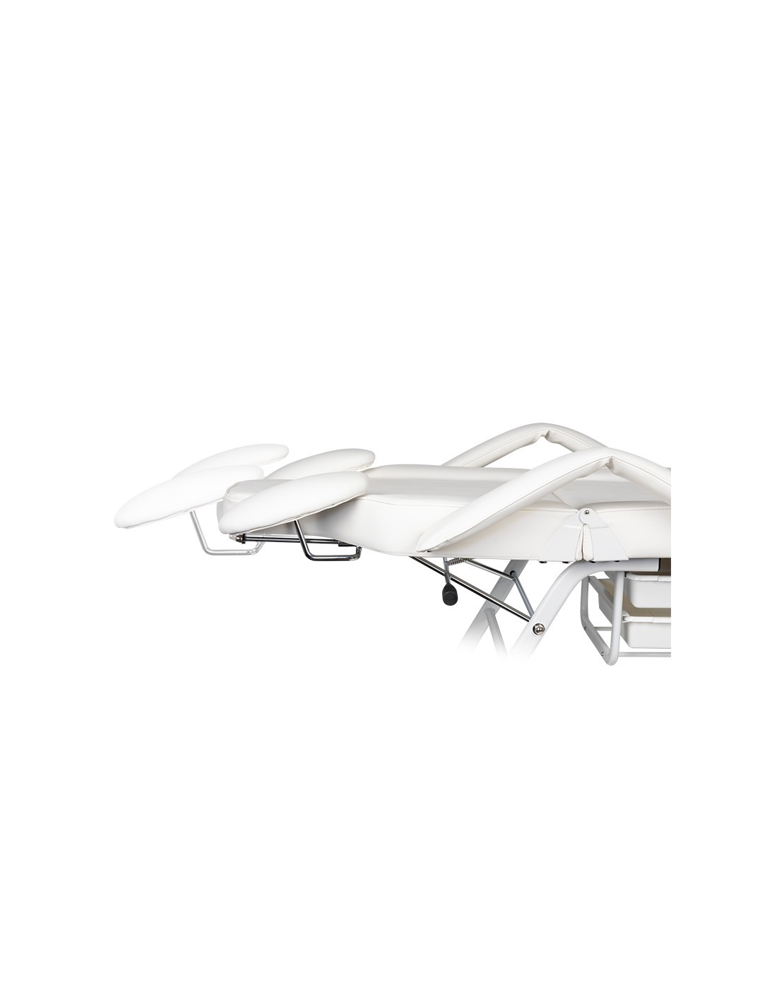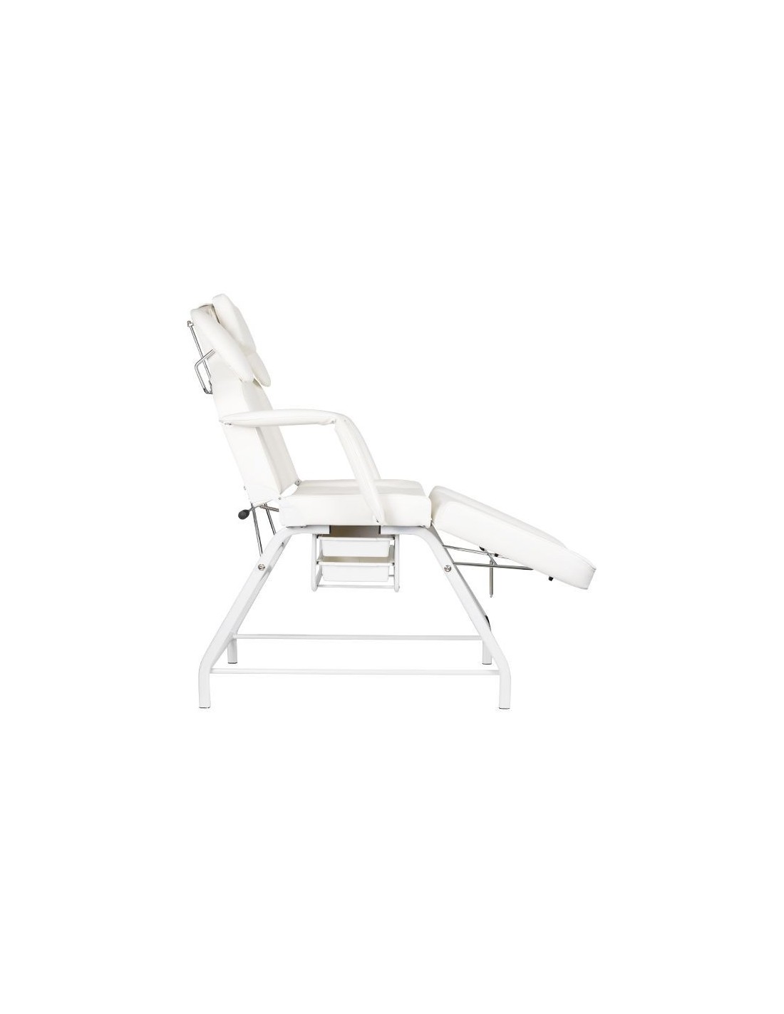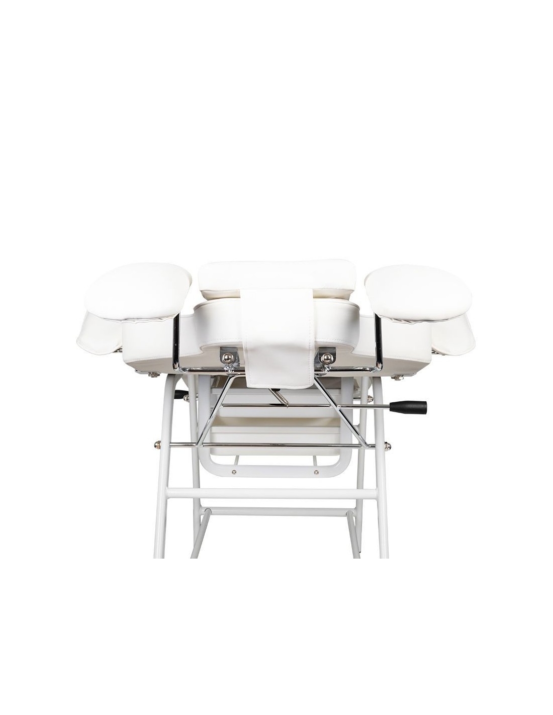 the chair has a manual adjustment of the footrest, backrest and arm support for the operator. the hand support used is an extremely practical solution not found in other armchairs. equipped with a comfortable pillow for the client and handy litter boxes for placing the necessary accessories.