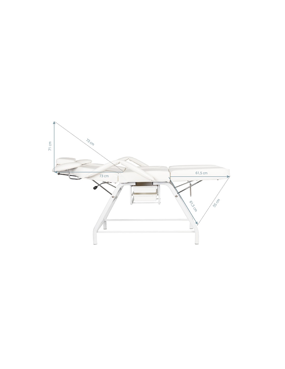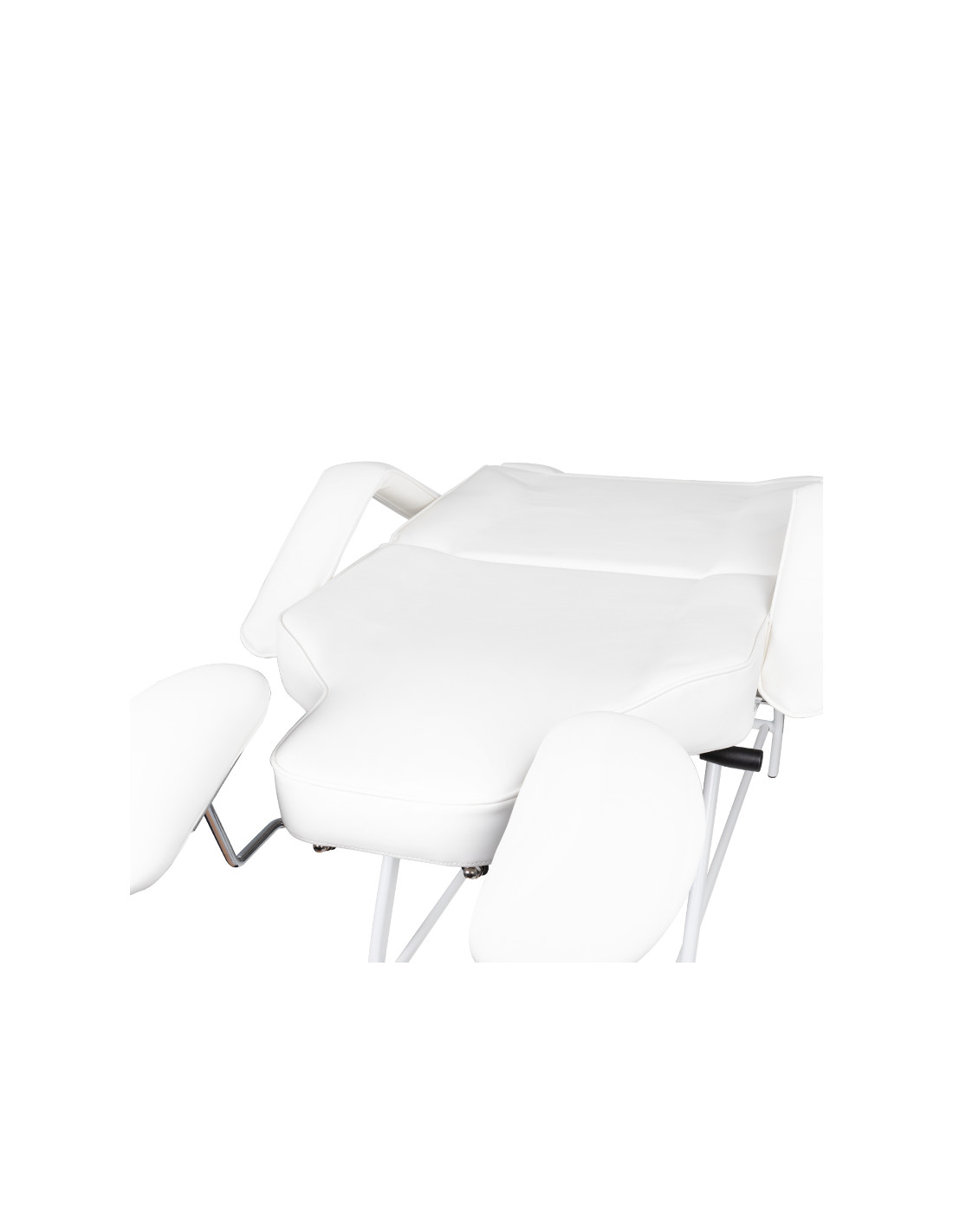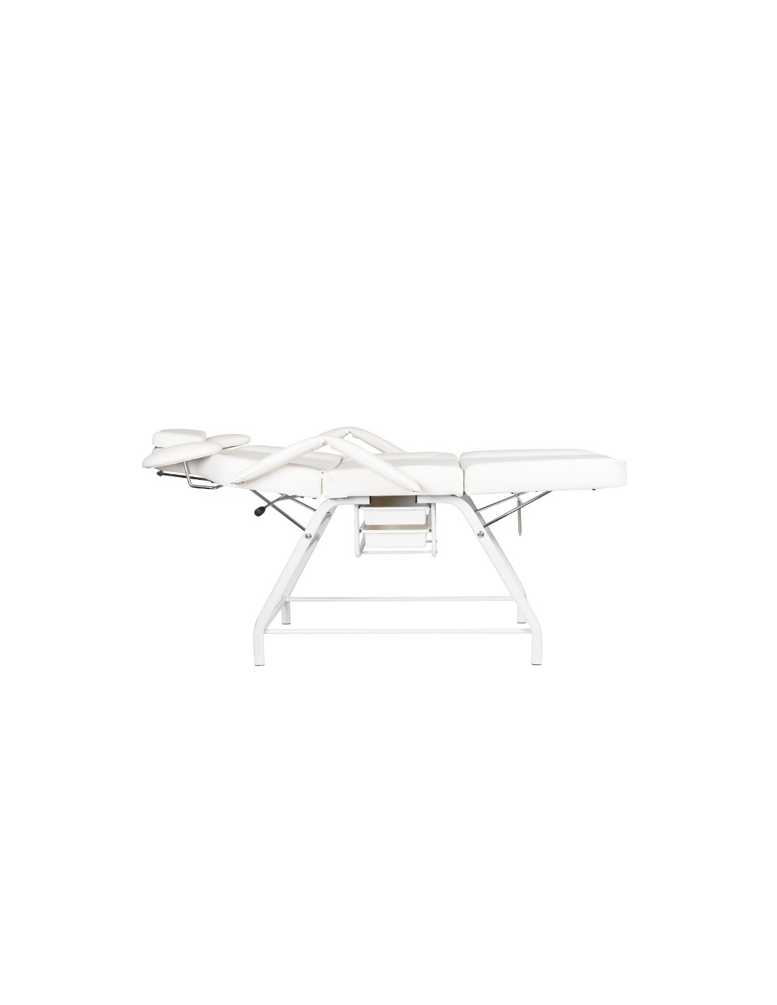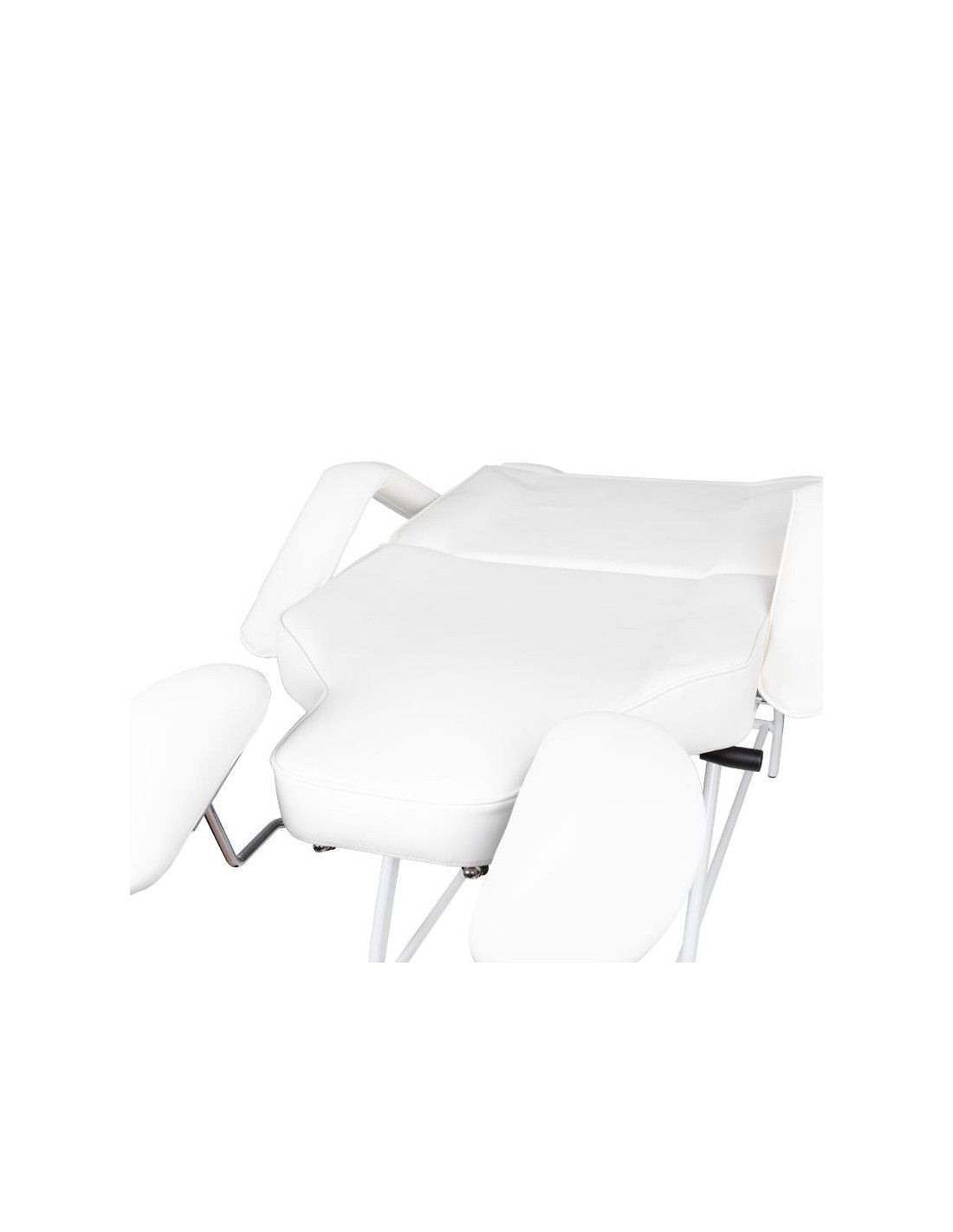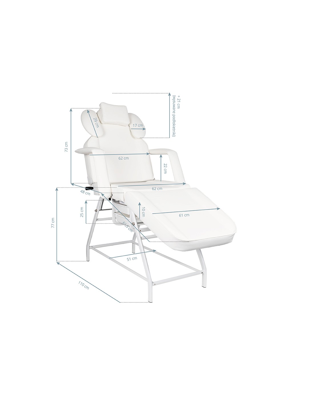 the chair has a manual adjustment of the footrest, backrest and arm support for the operator. the hand support used is an extremely practical solution not found in other armchairs. equipped with a comfortable pillow for the client and handy litter boxes for placing the necessary accessories.