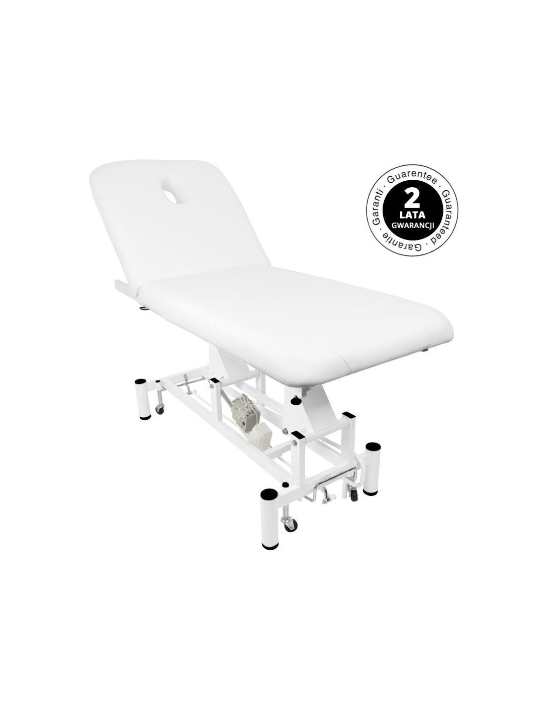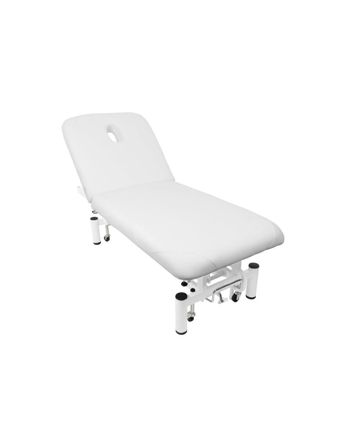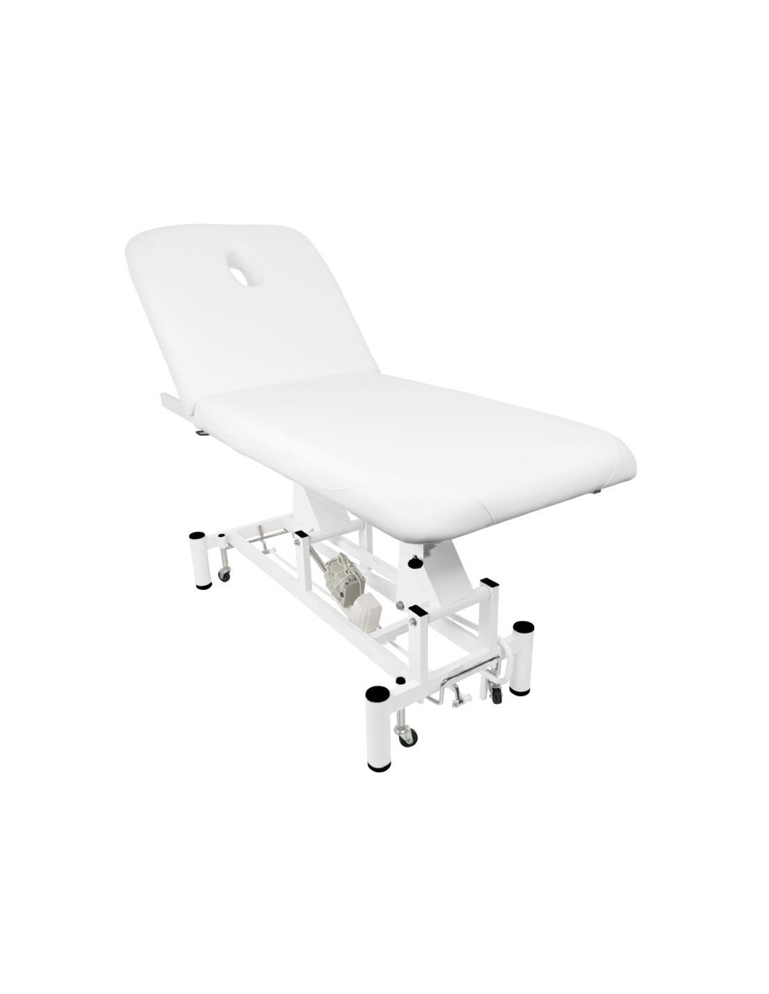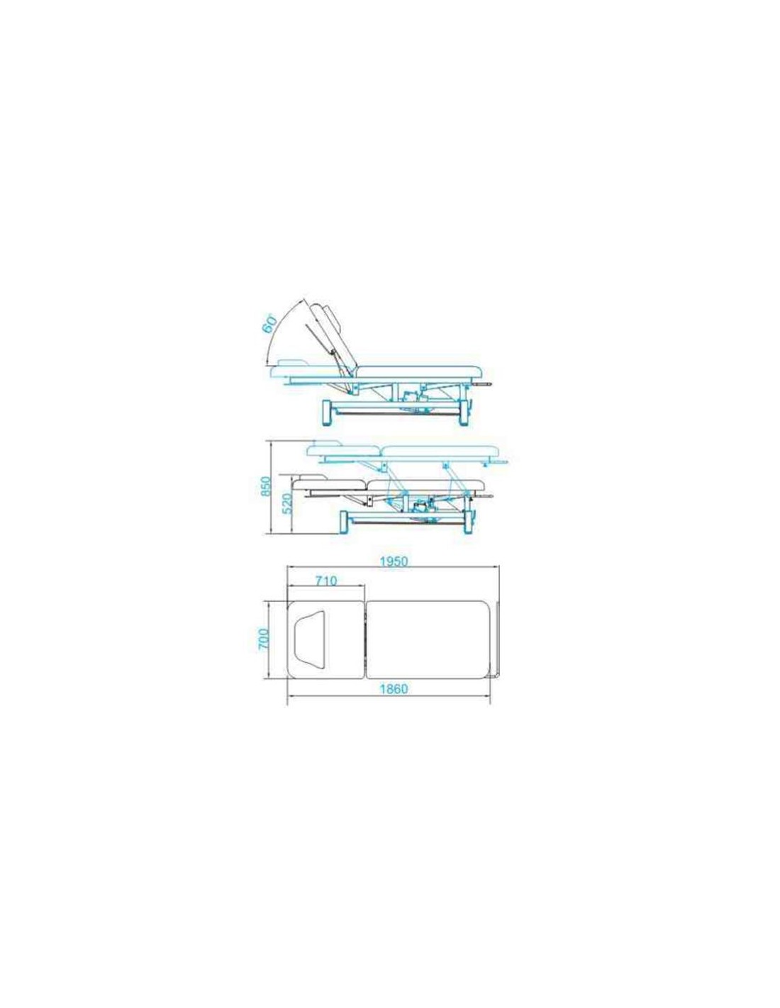High-performance massage bed, especially for physiotherapy treatments. Equipped with 1 motor, the height is electrically adjustable, the backrest and inclination are manually adjustable. The headrest is a cushion with a vent hole.