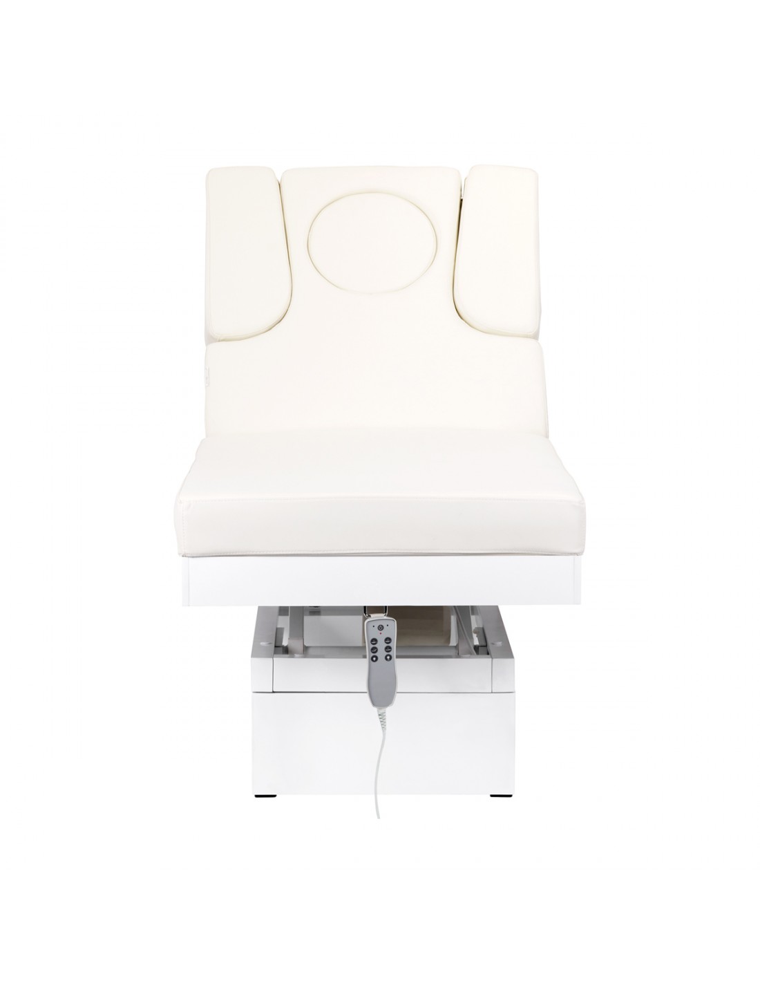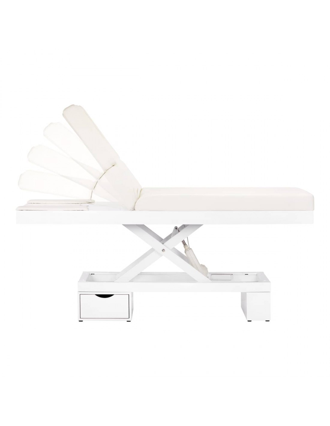 New beauty couch. An absolute hit among beds. Electric height adjustment in a very wide range - from 58 to 90 cm. The backrest is also adjustable using the remote control, from horizontal to almost vertical (raises to 80 degrees). Possibility of extending sideways or completely dismantling the side parts of the backrest. The set includes one pillow. In the lower part, under the backrest, there is a drawer for handy accessories. Wide piece of furniture (76 cm), with a thick and very comfortable mattress. Leznak is very stable. It is covered with high-quality eco-leather in a delicate shade of ecru.