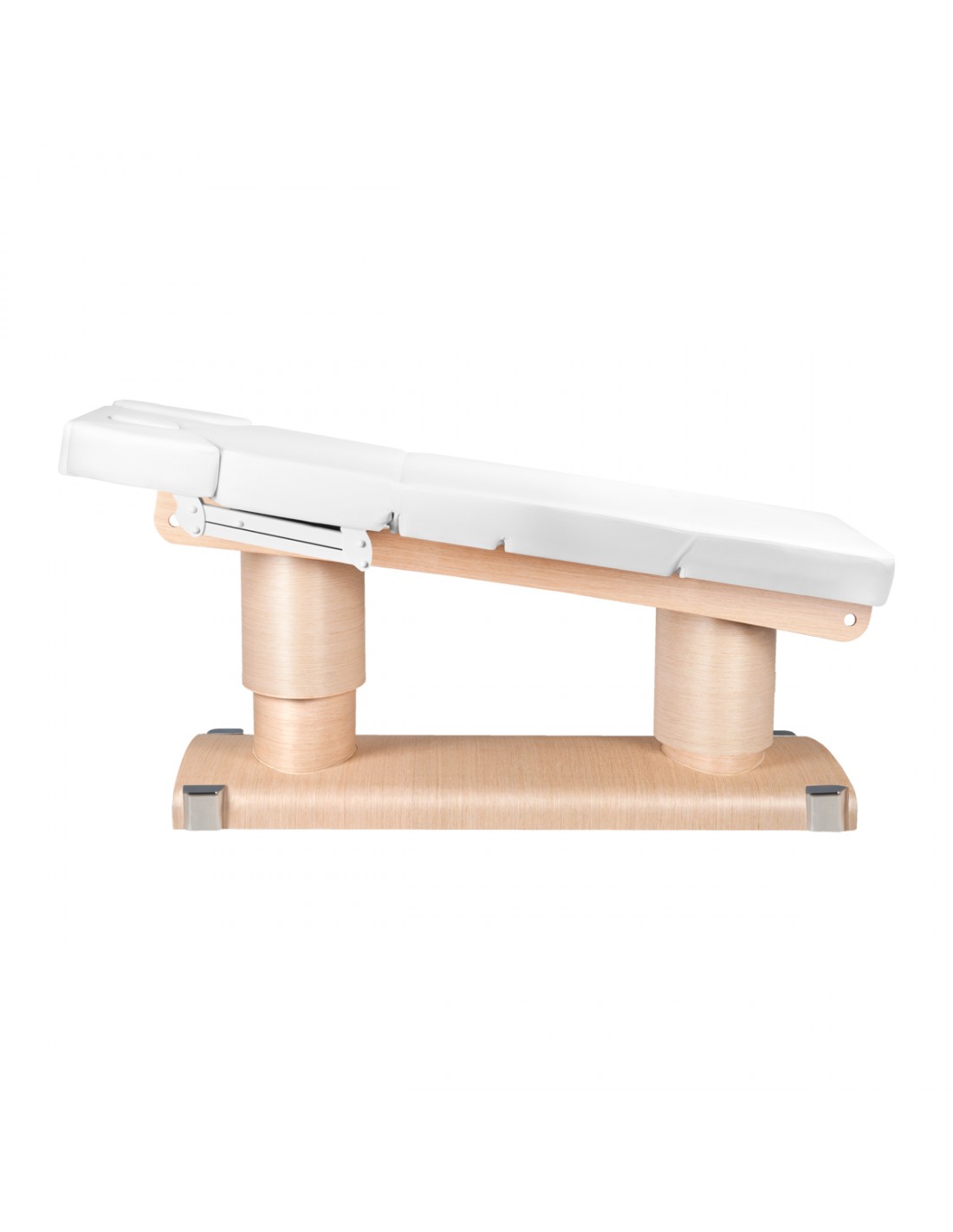 Electric cosmetic bed, adjustable in height in a very wide range from 64 to 82 cm. The backrest and footrests are also adjustable using a remote control. There is a face opening in the backrest and the support columns are independently controlled. Wide furniture (76 cm), with a thick and very comfortable and heated mattress. The lounger is very stable. It is covered with high-quality eco-leather in a delicate shade of ecru.
