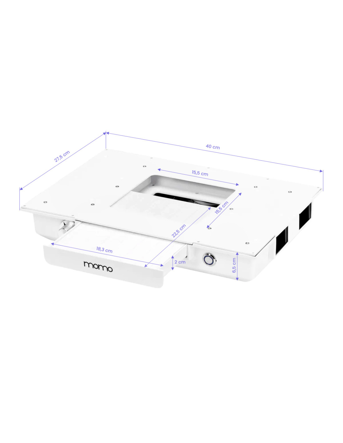 The Momo J-02 cassette dust collector built into the countertop significantly improves the comfort and hygiene of work, effectively removing dust generated during beauty treatments, such as manicures. Thanks to this device, the air in the salon remains clean and the workplace free from pollution, which increases the safety of both the beautician and clients. The dust collector is easy to use and maintain, which additionally enhances its functionality. Regular cleaning and filter replacement ensure consistently high absorption efficiency. It is possible to purchase additional replacement filters (SKU 123581).