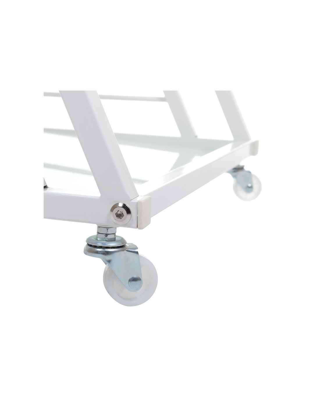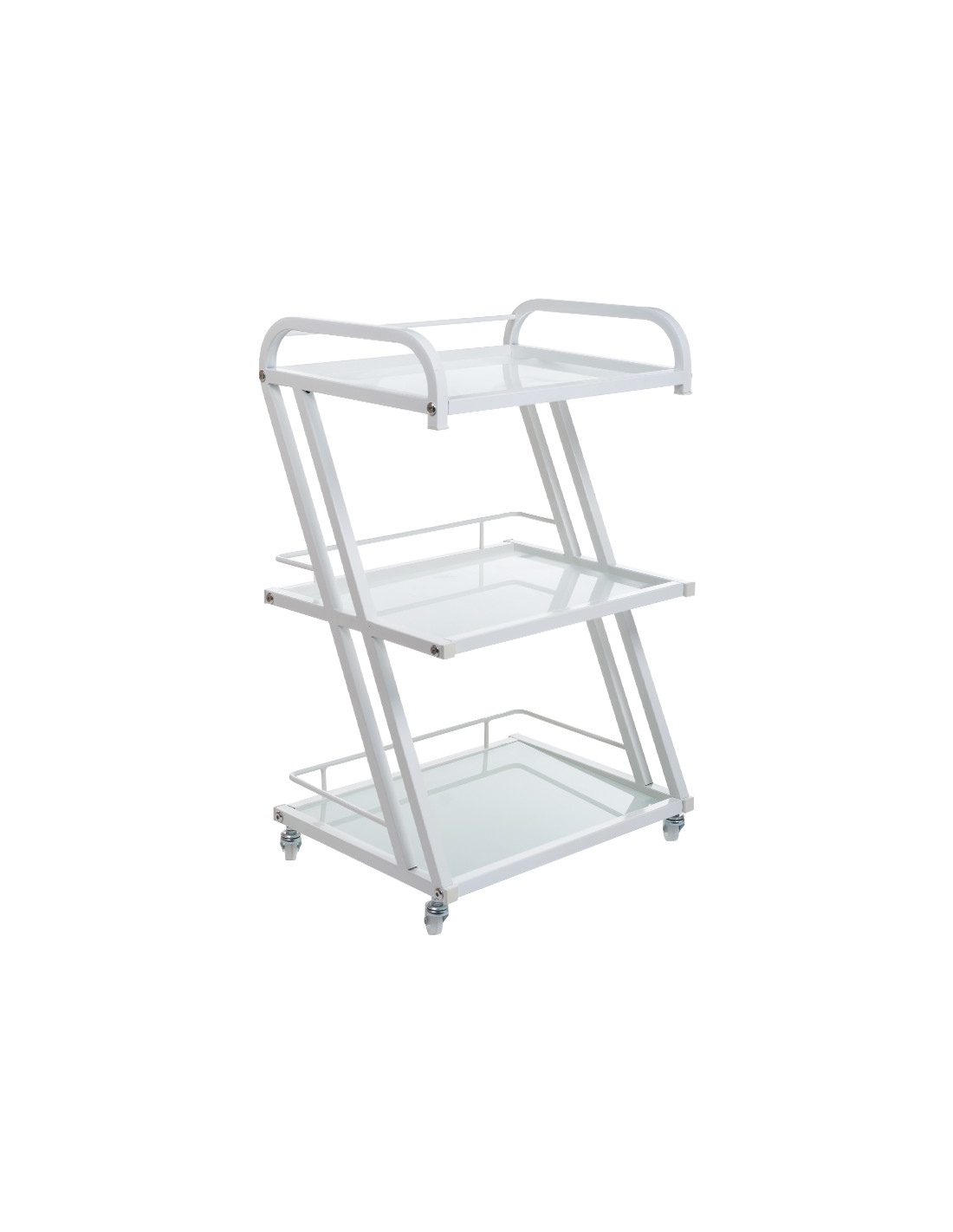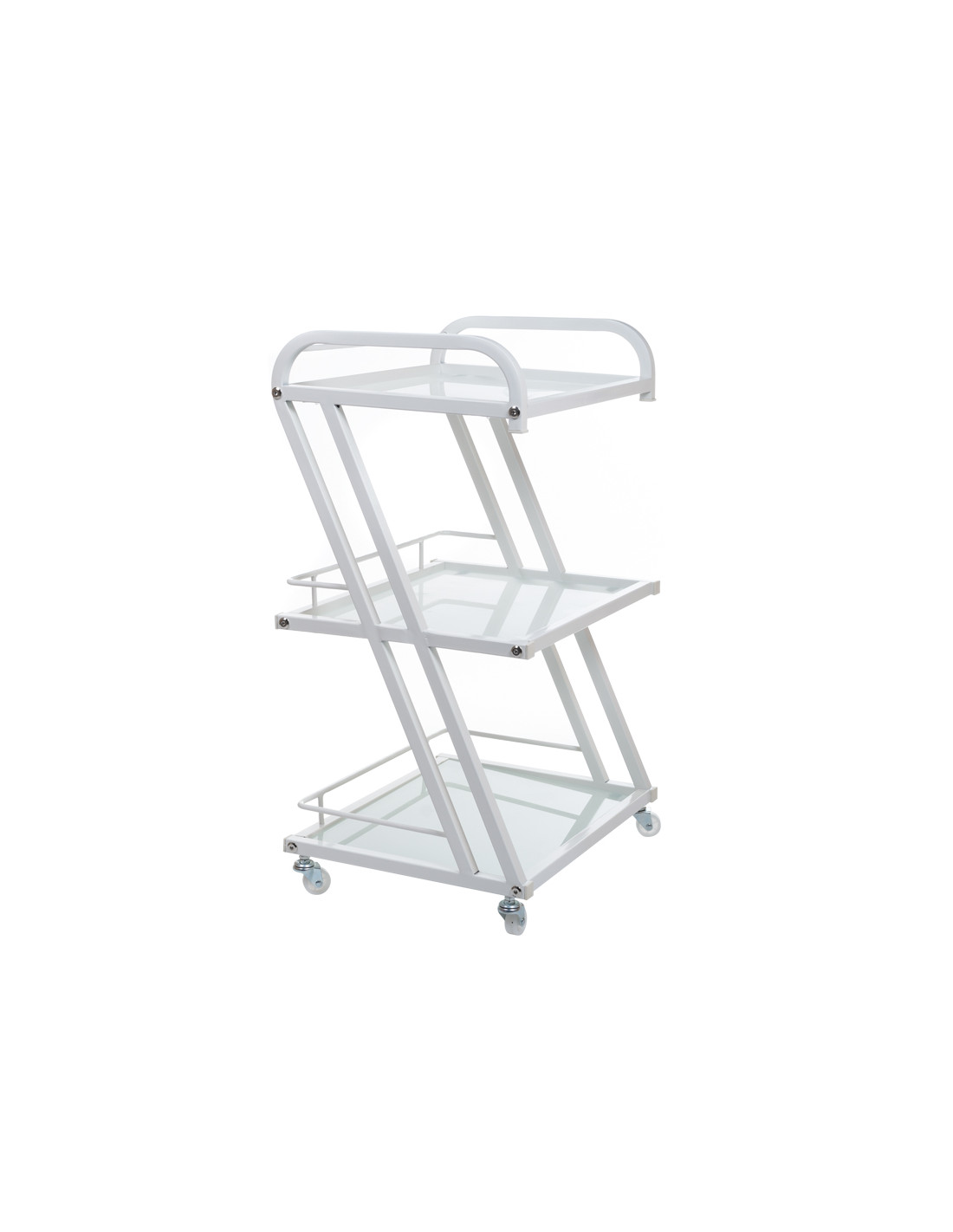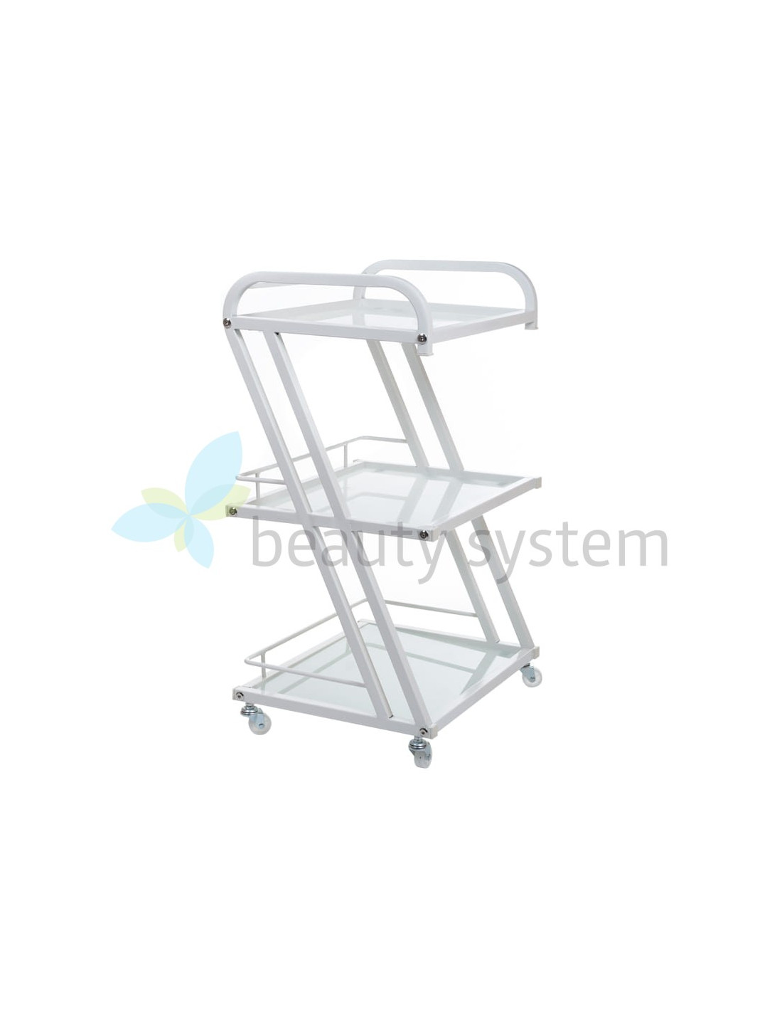 This beauty cabinet features an aluminum construction and glass tops. Wide shelves and mobility ensure comfortable use.
