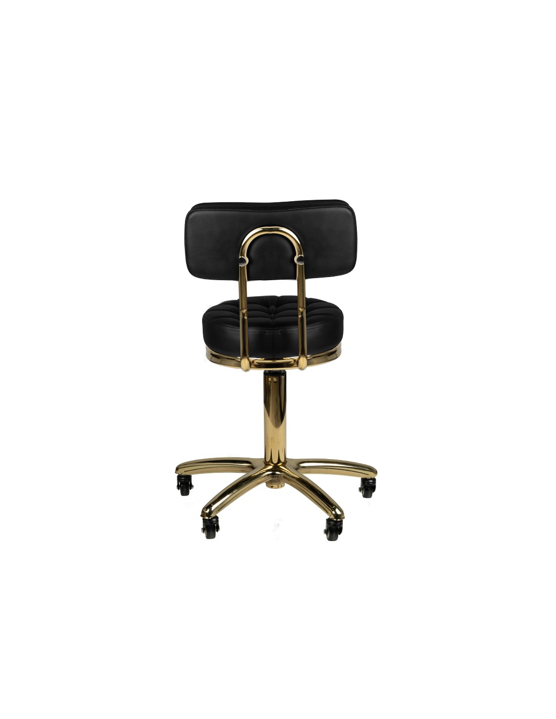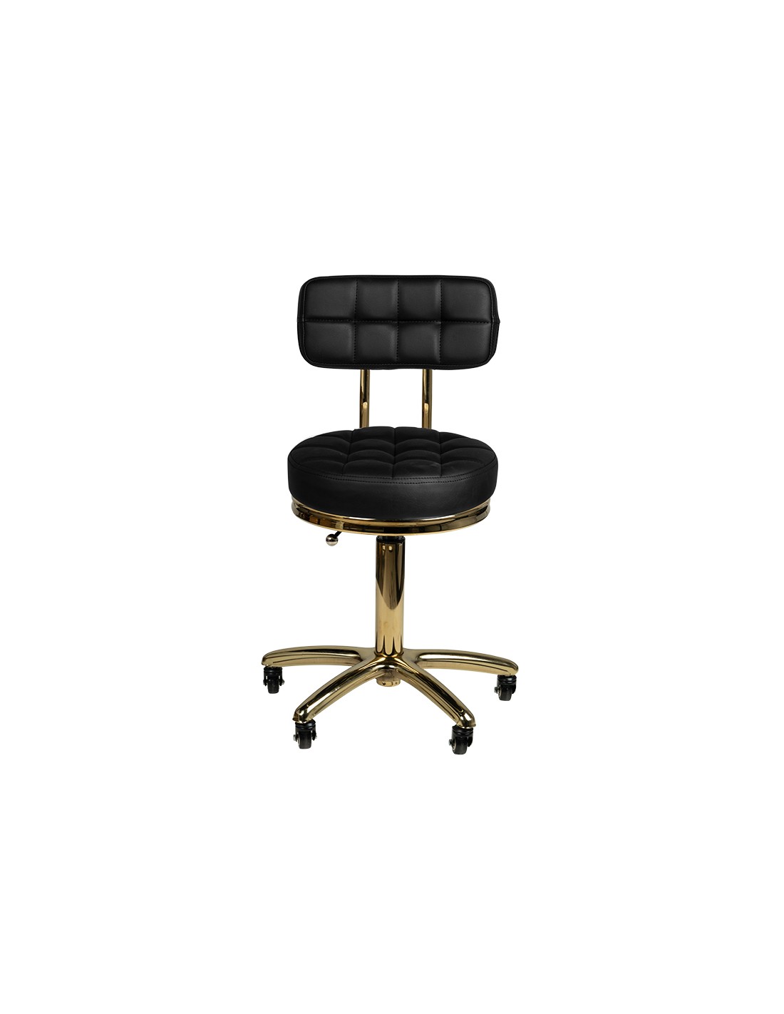 ACTIVESHOPUnique black cosmetic stool with a quilted seat and comfortable backrest. metal elements sparkle with golden color. it is height-adjustable and the arm-like base is equipped with solid metal-rubber wheels.