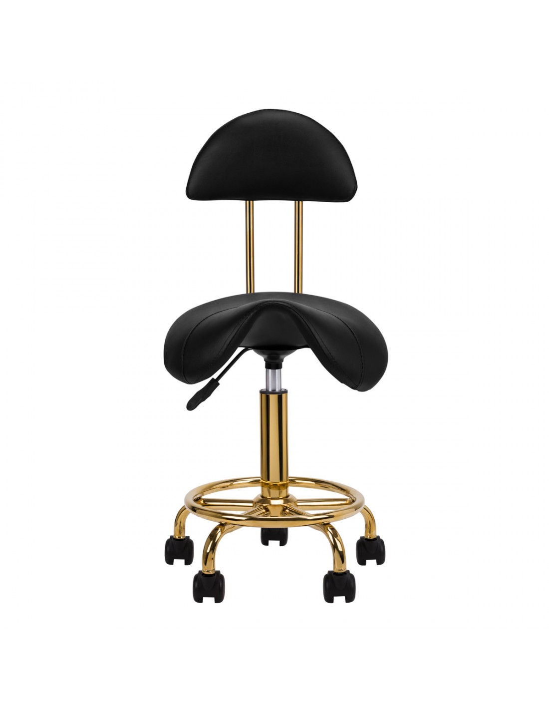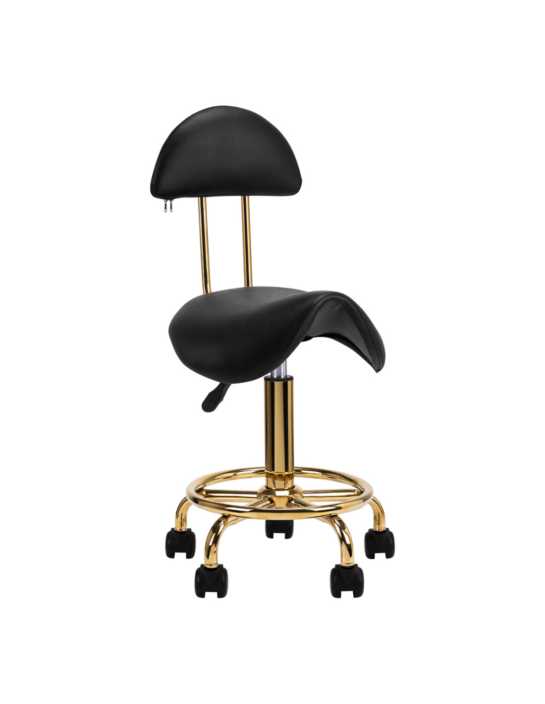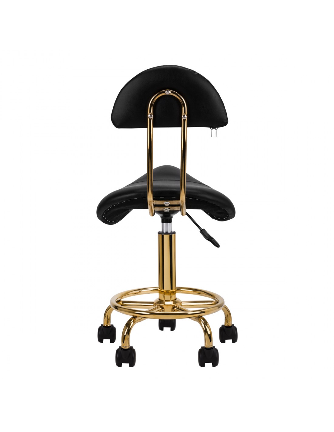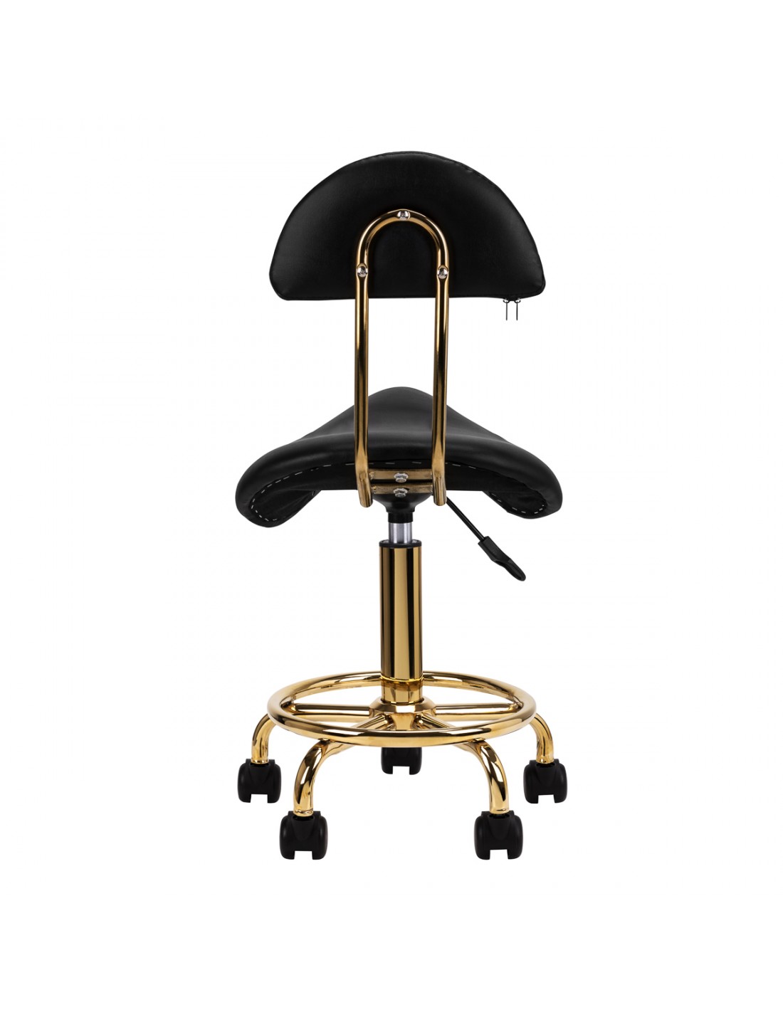 ACTIVESHOPComfortable, stable cosmetic stool with a backrest, with a profiled seat, gold-colored metal elements. On a five-star base with plastic wheels. Available in white, a necessary piece of furniture in a beauty salon. Lacquered metal surfaces.