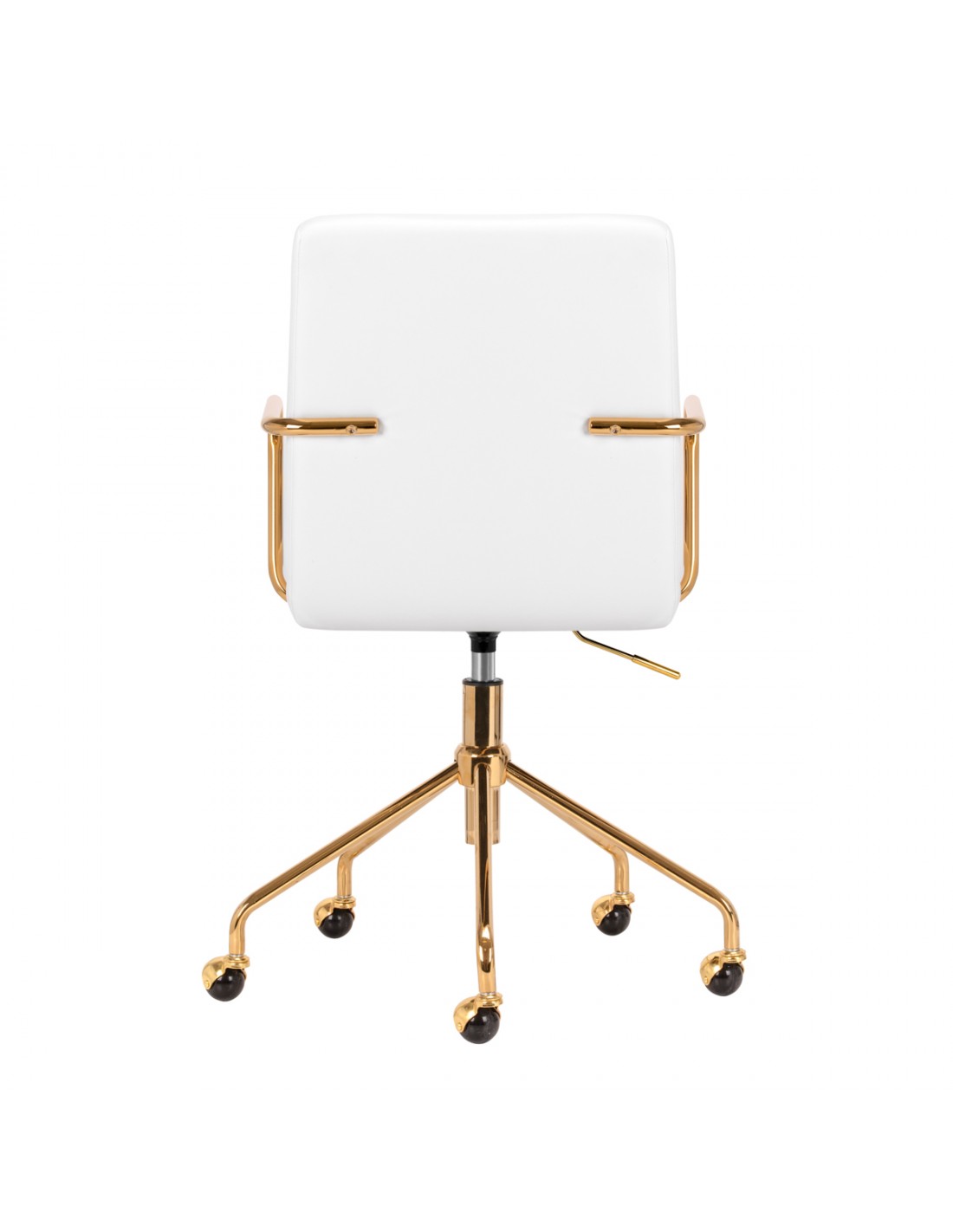 The pleasant-to-the-touch, synthetic leather upholstery in shades of white gives the furniture a unique character. The elegant finish makes it a real eye-catcher. The frame in shades of gold adds elegance, perfectly matching simple shapes. Functional castors provide significant mobility, making it easier to move the chair and move around the salon while working. The aesthetics of workmanship, comfort of use and ergonomically profiled backrest make the chair meet the requirements of even the most demanding users.