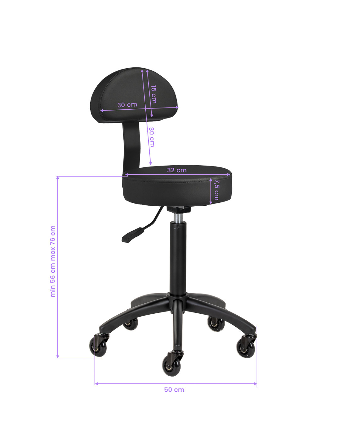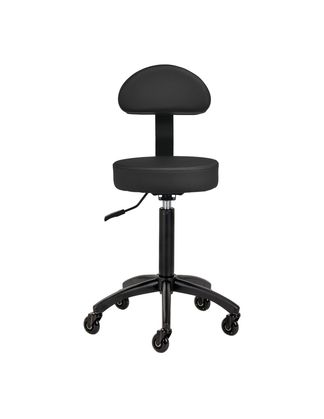 The seat height adjustment ranges from 56 to 76 cm, allowing for a customised position to the individual needs of the professional while performing services. The backrest supports the spine, ensuring comfort even during prolonged work. The full rotation mechanism increases freedom of movement, resulting in greater comfort and efficiency. Mobility is ensured by Roll Speed wheels with an iron core and polyurethane (PU) coating, which combine smooth movement with exceptional wear resistance. The use of ABEC-7 bearings makes the stool easy to move, significantly facilitates manoeuvring.
