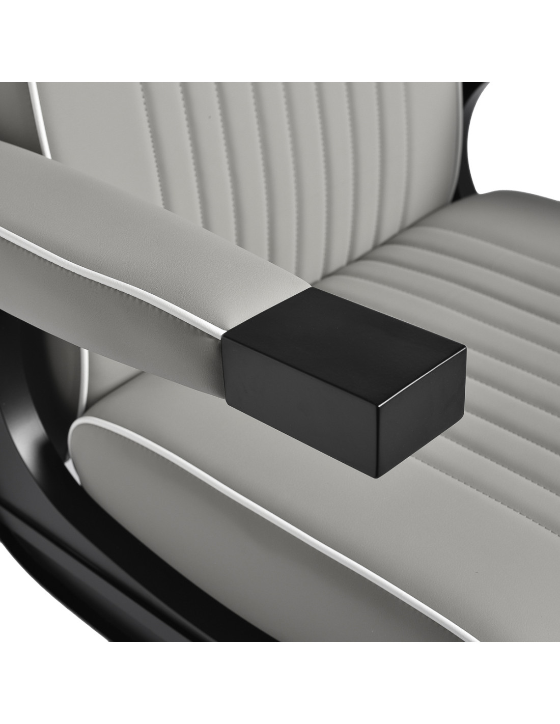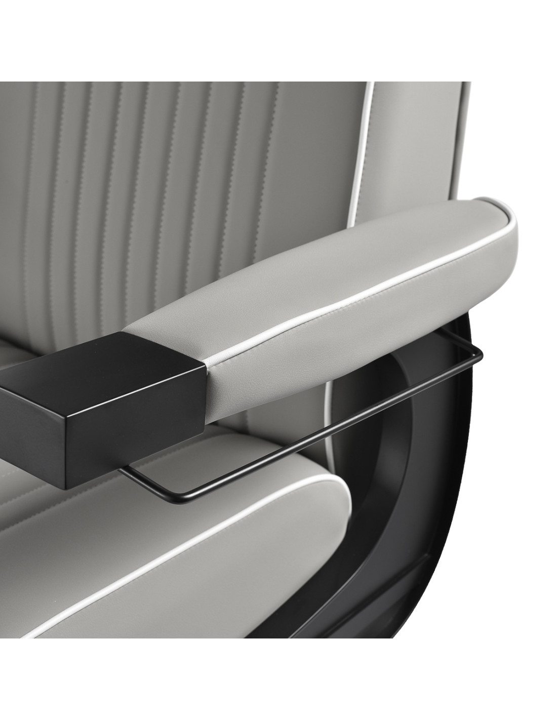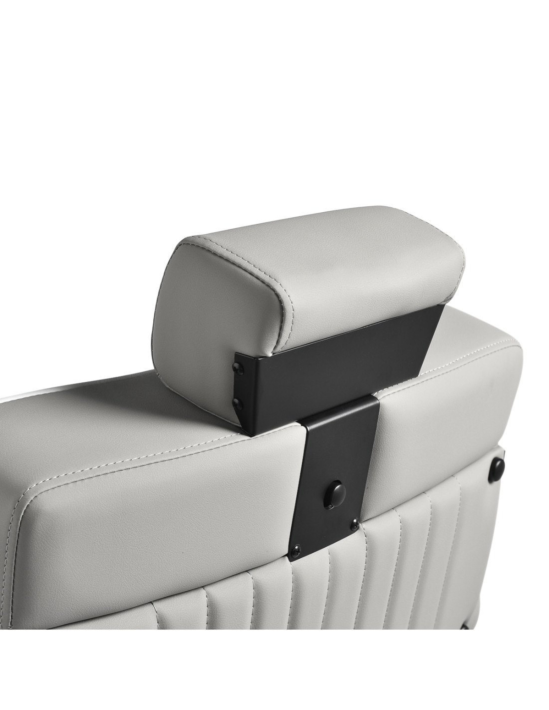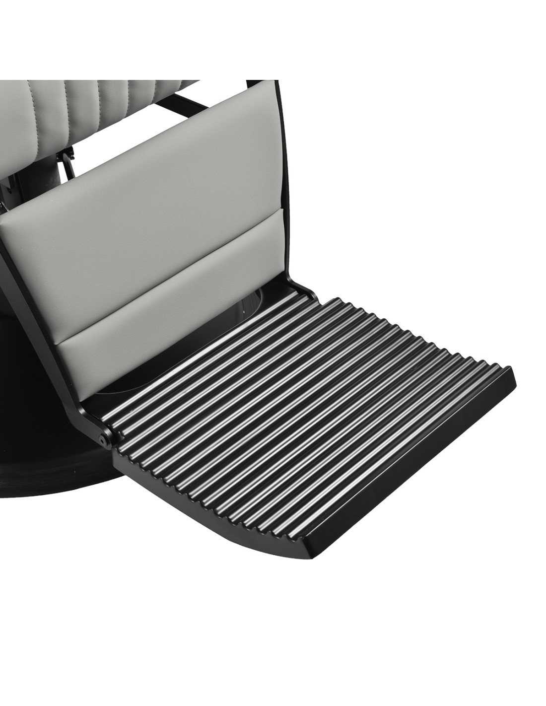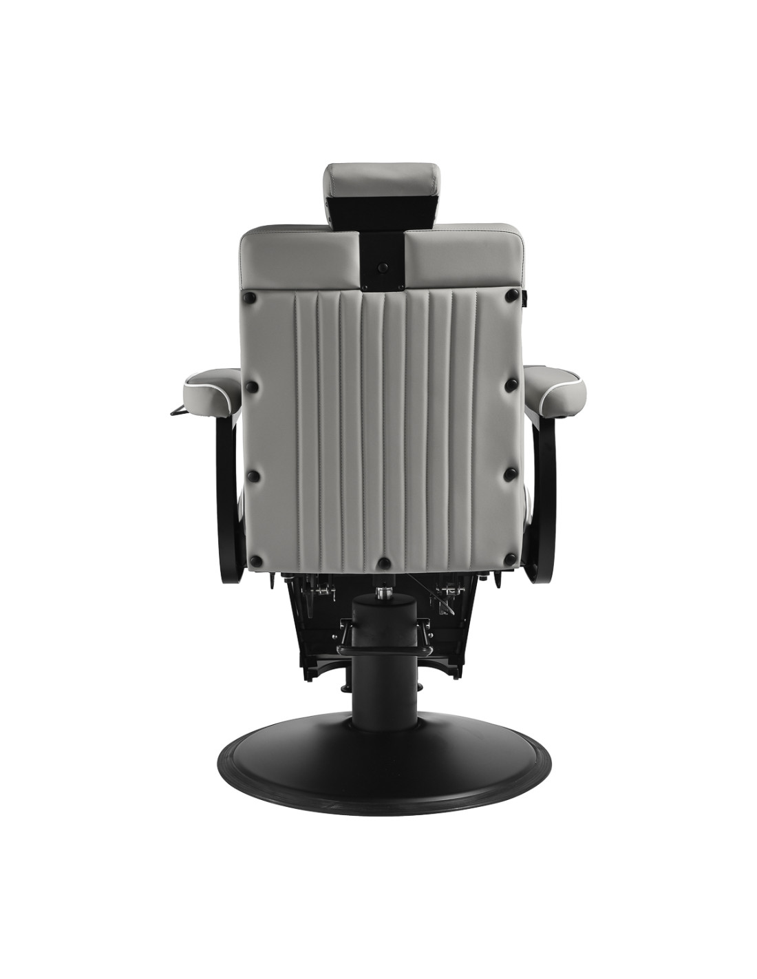The black, round base ensures stability and durability. The soft, matte synthetic leather upholstery combines comfort with durability. The materials used are moisture-resistant, durable and easy to clean. Stylish stitching and grey-toned upholstery give it a unique character, perfectly complementing the décor of modern barbershops. The combination of the elegant upholstery colour with the black frame and base emphasises the modern, professional look of the chair.
