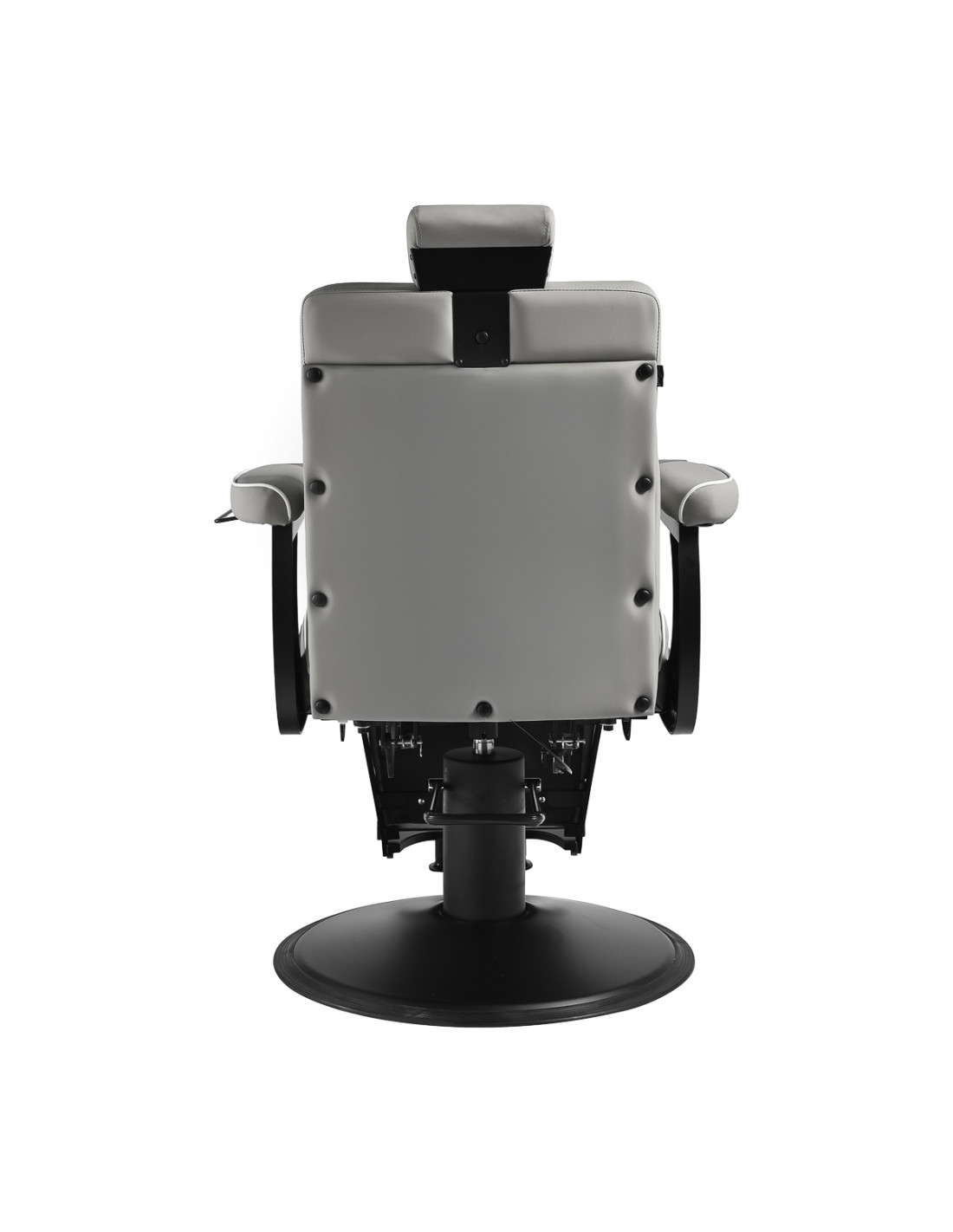 The black, round base ensures stability and durability. The soft, matte synthetic leather upholstery combines comfort with durability. The materials used are moisture-resistant, durable and easy to clean. Stylish stitching and grey-toned upholstery give it a unique character, perfectly complementing the décor of modern barbershops. The combination of the elegant upholstery colour with the black frame and base emphasises the modern, professional look of the chair.