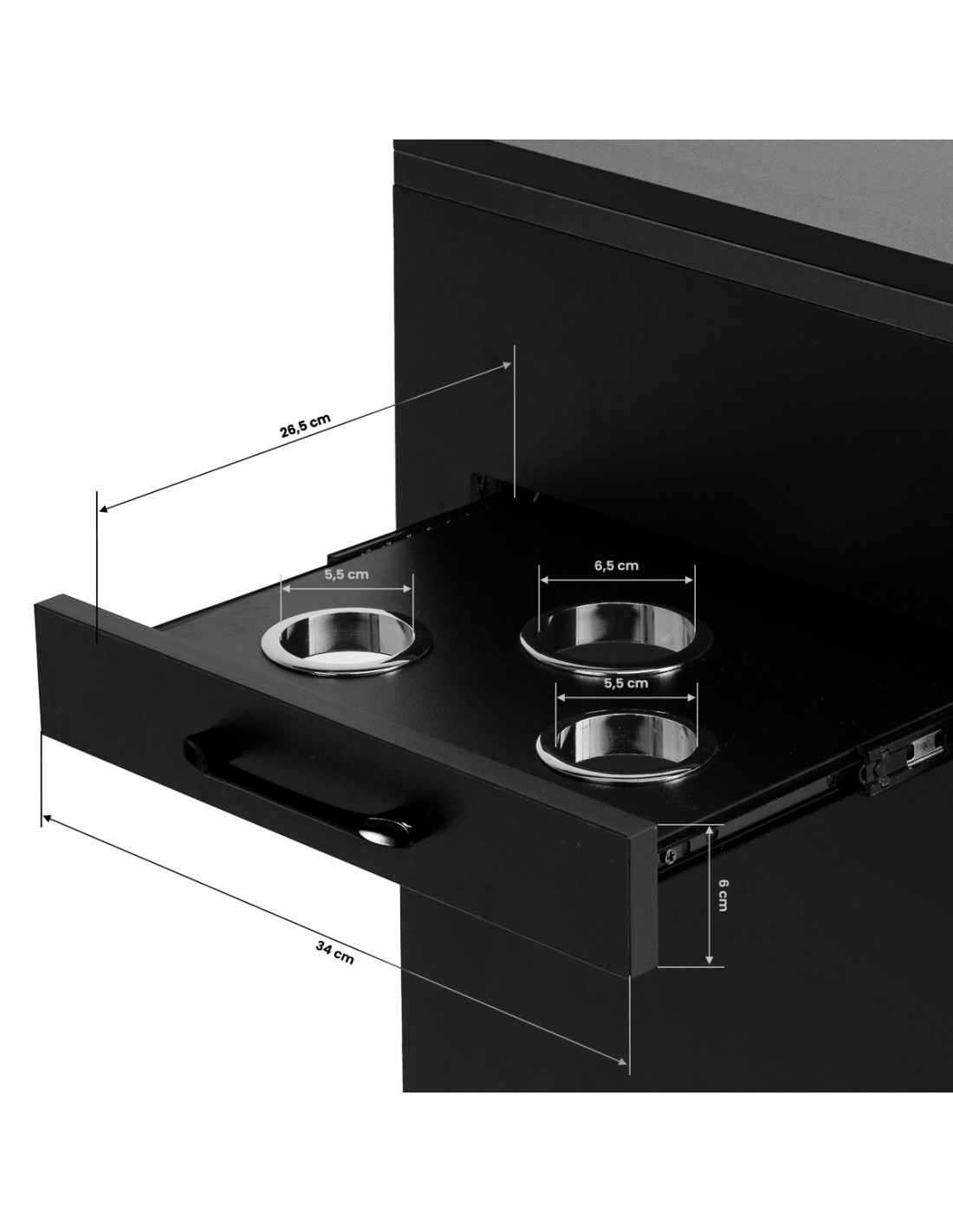 The Trolley has an additional side pull-out drawer with metal tool holders. The three openings are perfect for holding hair dryers, curling irons, straighteners or brushes, allowing you to conveniently store your equipment during treatment. This solution provides free access to the most necessary tools without putting them away on the work surface.