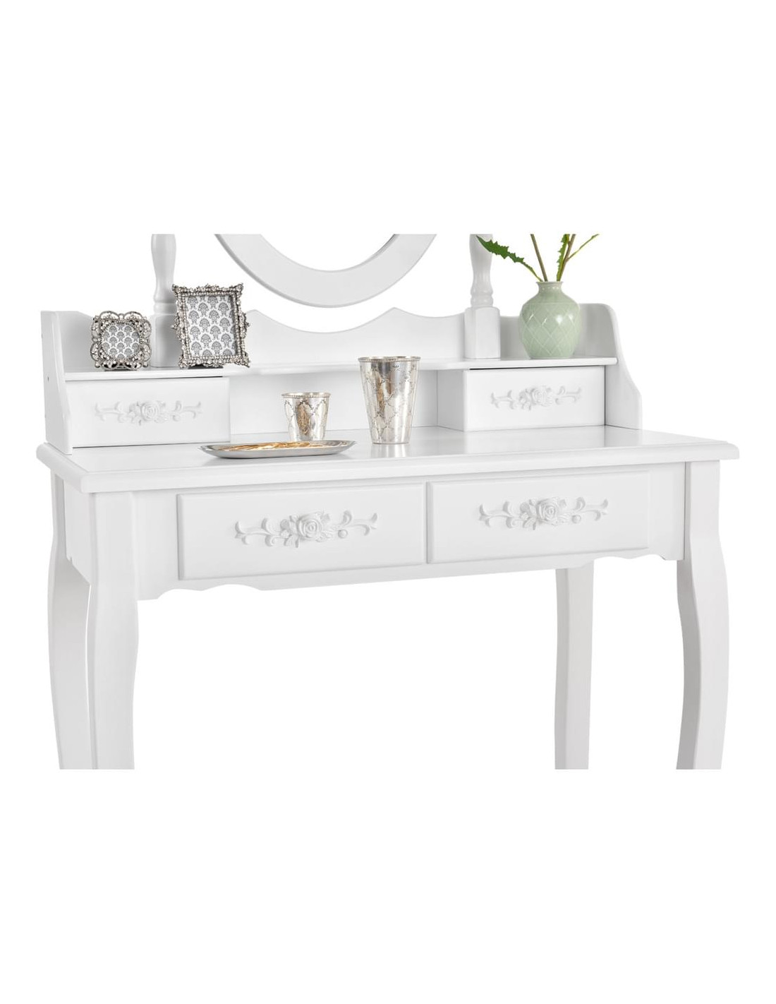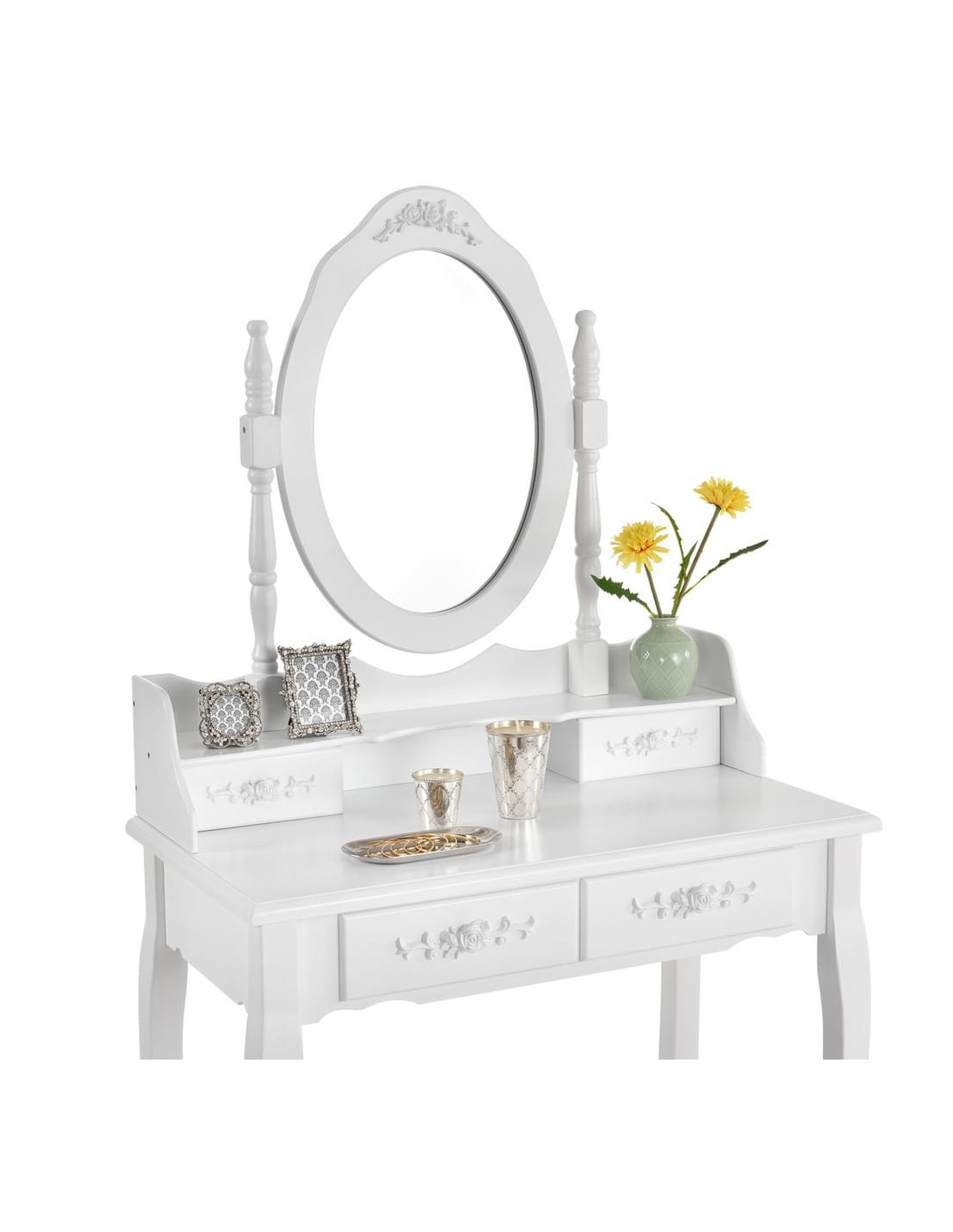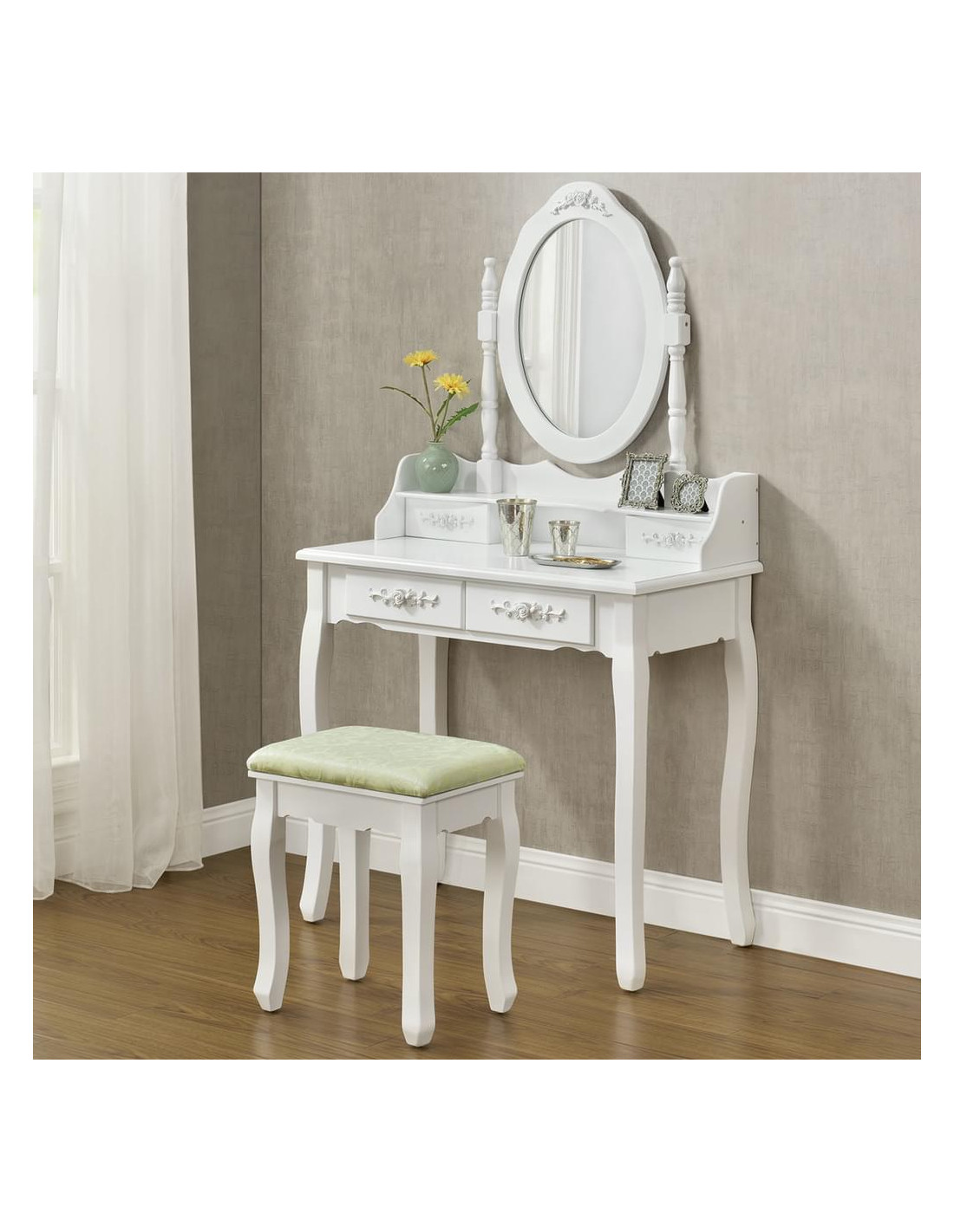 - Integrated mirror & 4 storage drawers.