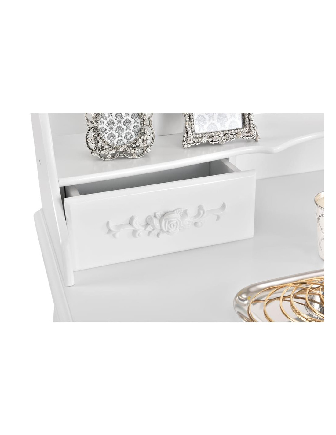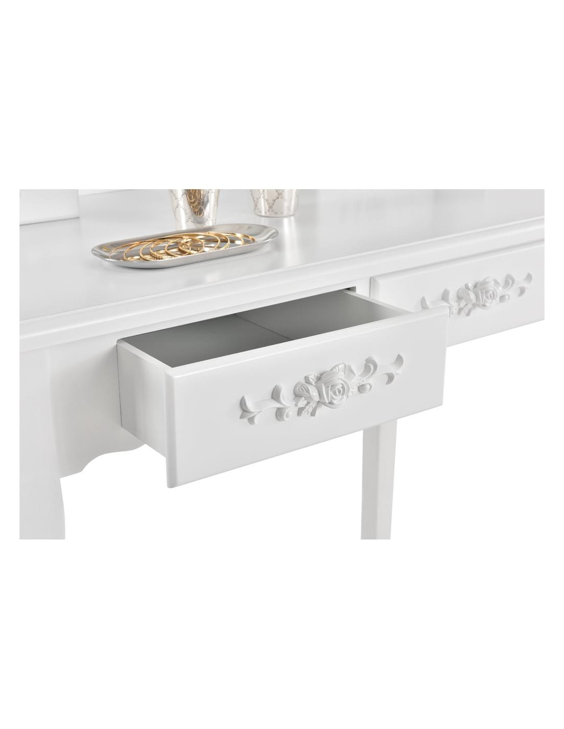 White MIRA Dressing Table with Mirror, 4 Drawers + Stool