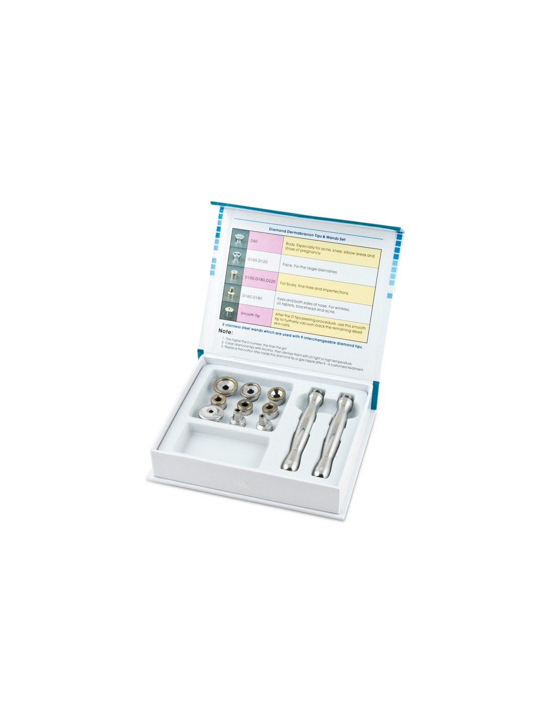 Diamond microdermabrasion, includes 2 pens, 8 diamond tips, and one smooth tip for massage,