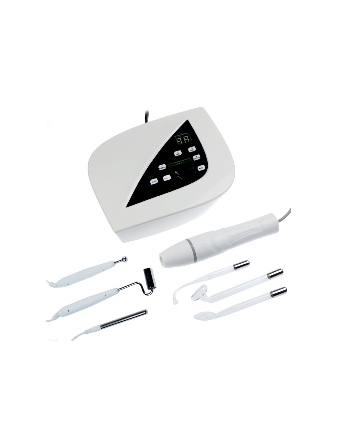 D'Arsonval - enables the performance of electromassages using the so-called d'Arsonval currents. The sparking that occurs when the glass electrode comes into contact with the skin has a stimulating effect on the skin, subcutaneous tissues, muscles, and indirectly on internal organs. The ozone produced during the treatment has a bactericidal effect. The action of electrical charges causes the dilation of blood vessels in the skin, accelerates metabolism, which is an important factor in increasing the absorption of nourishing and medicinal substances contained in cosmetic preparations.