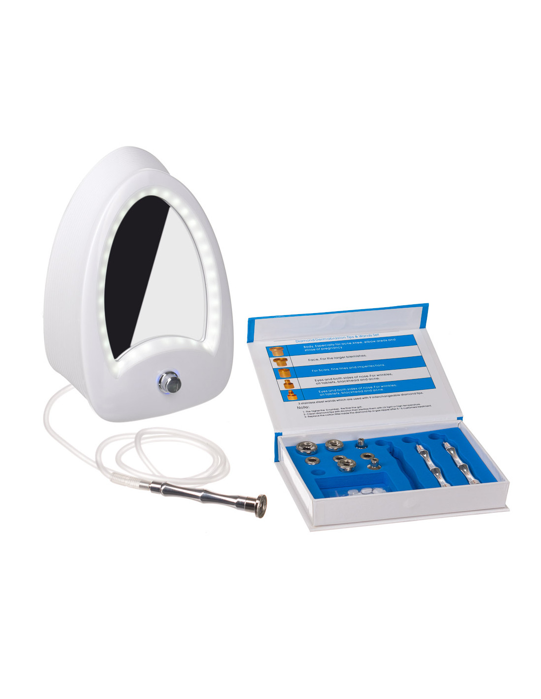 Diamond microdermabrasion is a modern and highly effective method of mechanical exfoliation of the horny layer of the epidermis. The results are visible immediately after the treatment, which is why so many clients choose it. Therefore, it is worth choosing a portable, high-class device that will guarantee excellent results. The set includes 9 diamond tips, three pens, and filters. The whole is enclosed in a nice casing, which when opened also has a mirror useful for work.