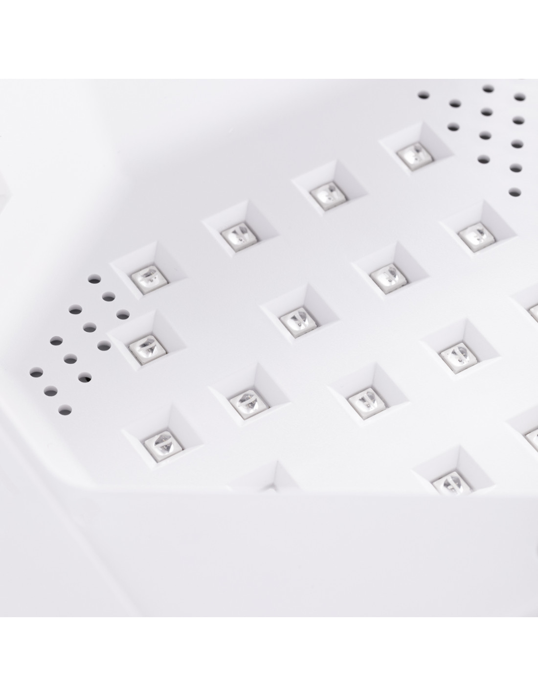 The lamp housing is made of durable plastic and combines a modern, minimalist design with practical application. The lamp is easy to clean, resistant to damage and has dimensions that allow for comfortable positioning of the entire hand or foot, ensuring quick and even curing of the styling. The removable magnetic bottom facilitates pedicures as well as cleaning and disinfecting the device, increasing comfort and hygiene in the salon.