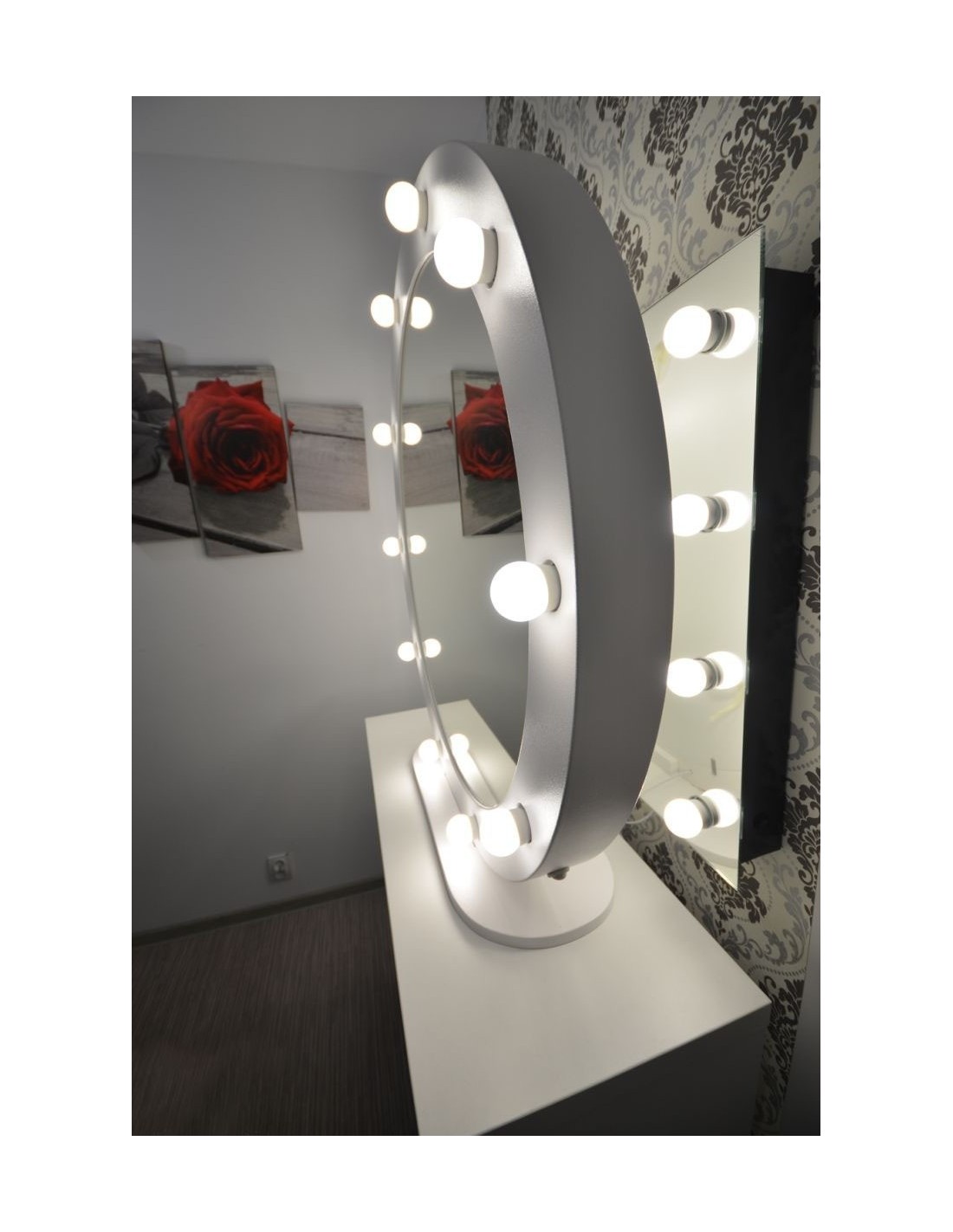 The Hollywood mirror is also ideal for various events, exhibitions or fairs. We also offer an additional table which combines with the Hollywood mirror to create a professional mobile makeup station. There is a small on/off switch concealed in the mirror’s frame and a power cable is included.