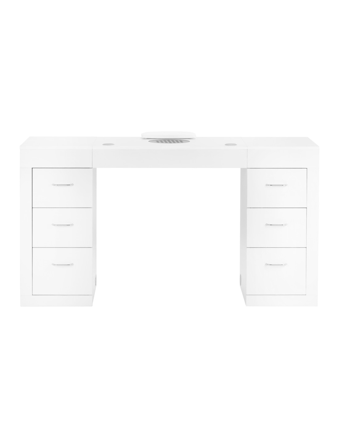 Cabinets on both sides with three capacious drawers make it much easier to organize and keep the most necessary cosmetics and tools in order. Thanks to this, the necessary products are always at hand, which translates into work efficiency. The desk has special holes in the tabletop for routing cables from necessary devices, which allows you to easily maintain order and aesthetics of the workstation.