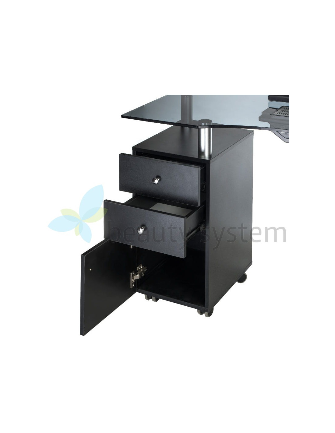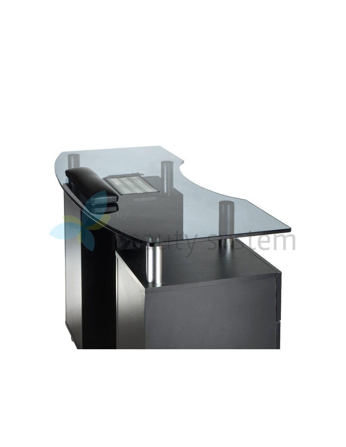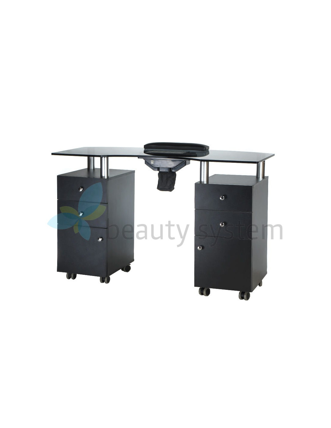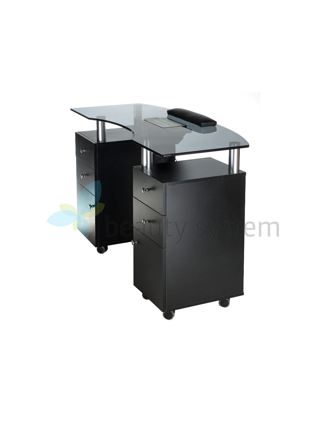 We offer a very elegant and functional table with an elegant black glass top and a dust collector. Furniture for beauty salons must be maximally useful to ensure comfortable working conditions. The BD-3453+P manicure table is mobile, has deep cabinets and practical drawers. The set is complemented by a comfortable treatment cushion. Solid construction, effective design are the hallmarks of Beauty System. Choose the BD-3453+P manicure table with a one-year warranty!