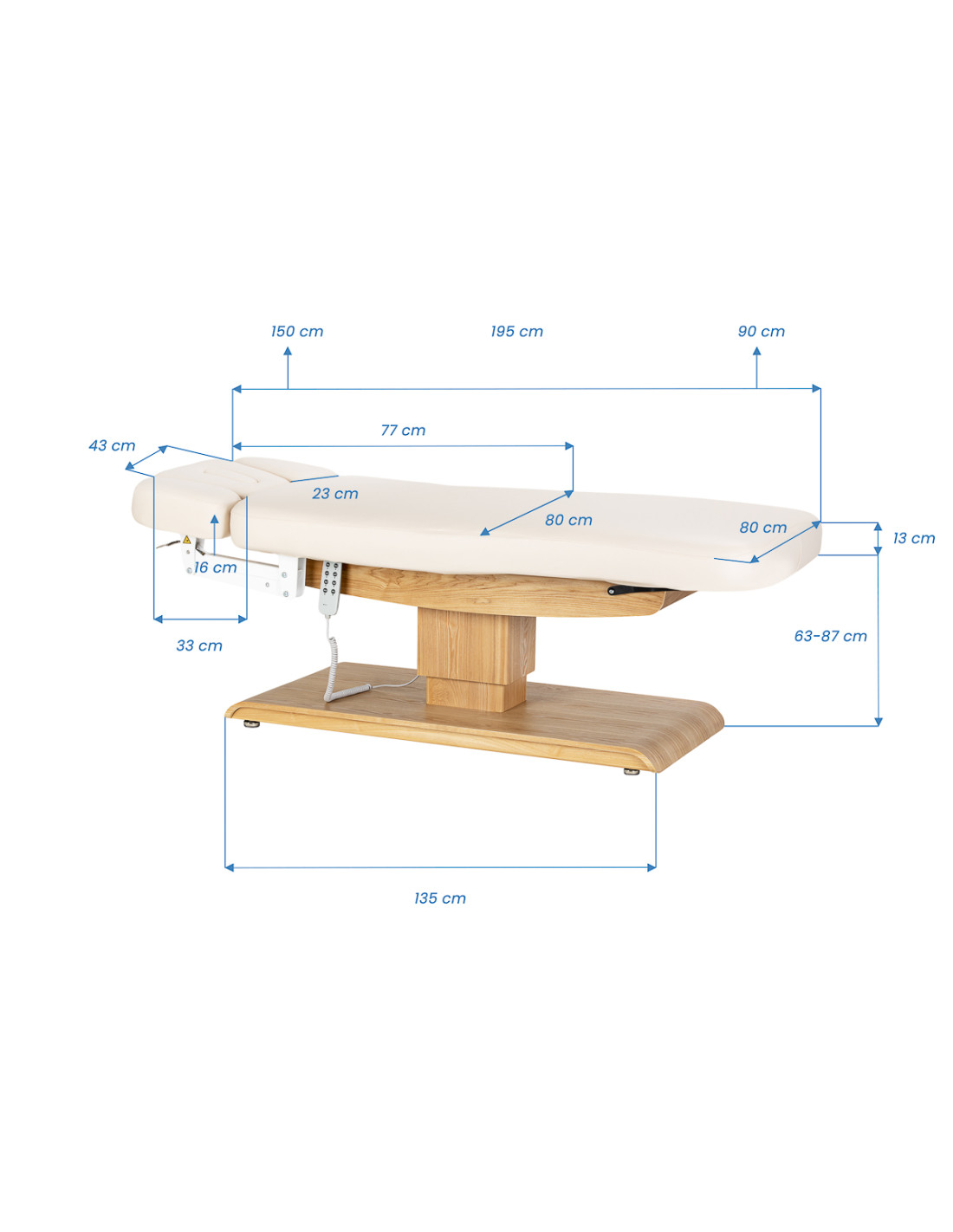 The lounger is equipped with electric height adjustment in the range of 63-87 cm and angle adjustment of the backrest and footrest, which allows you to precisely adjust the position to the type of treatment being performed. The wide range of adjustments makes it easy to adopt an ergonomic working position, regardless of the specialist's height or the specifics of the procedure. Control is via a practical remote control, whose clearly marked buttons allowintuitive operation of all functions, which translates into ease of use and smooth operation in the salon. Simultaneous adjustment of the backrest and footrest with a single button allows you to quickly set the sitting, semi-reclining or reclining position without interrupting the procedure. Smooth adjustment of settings supports ergonomic work and increases customer comfort at every stage of the procedure.