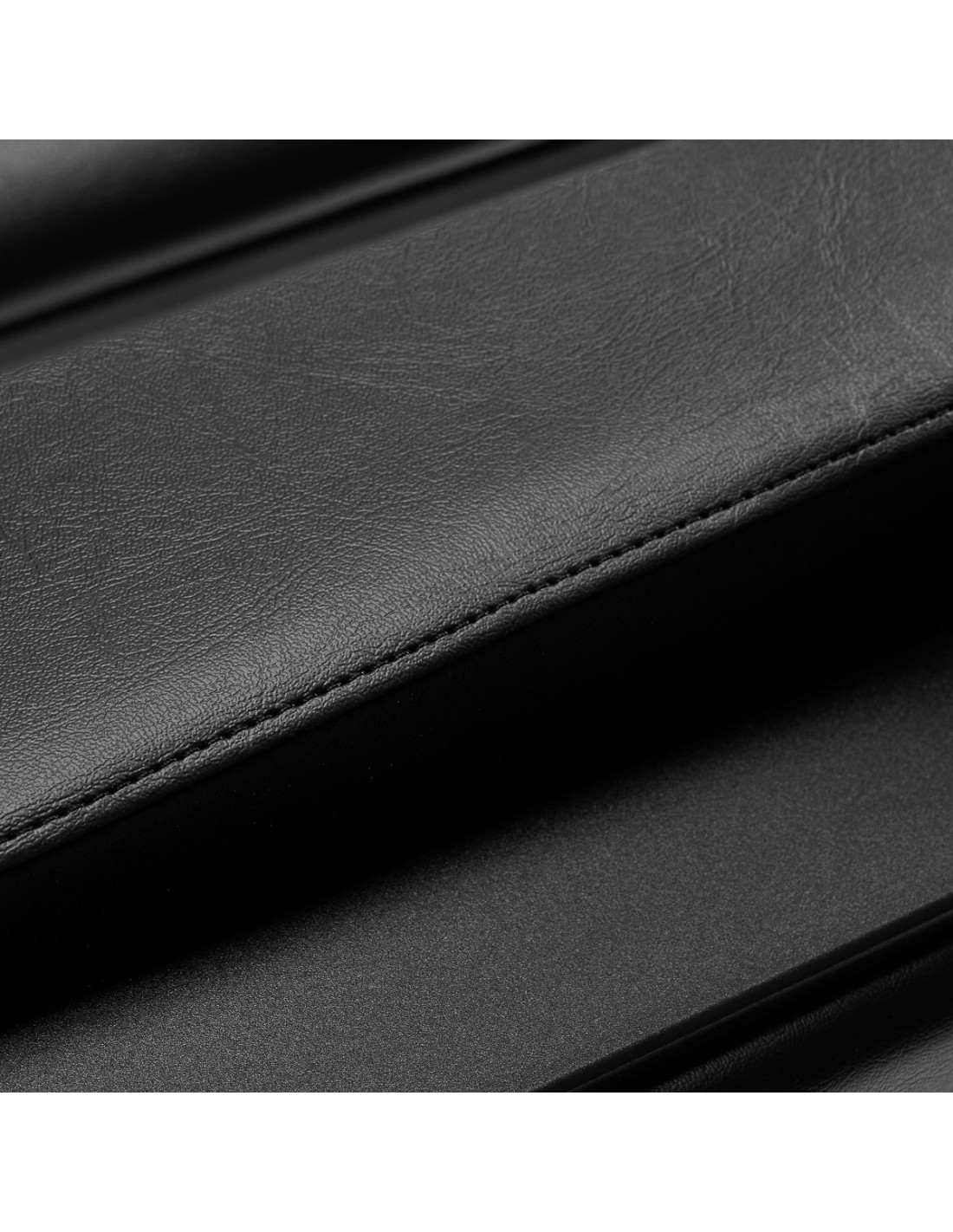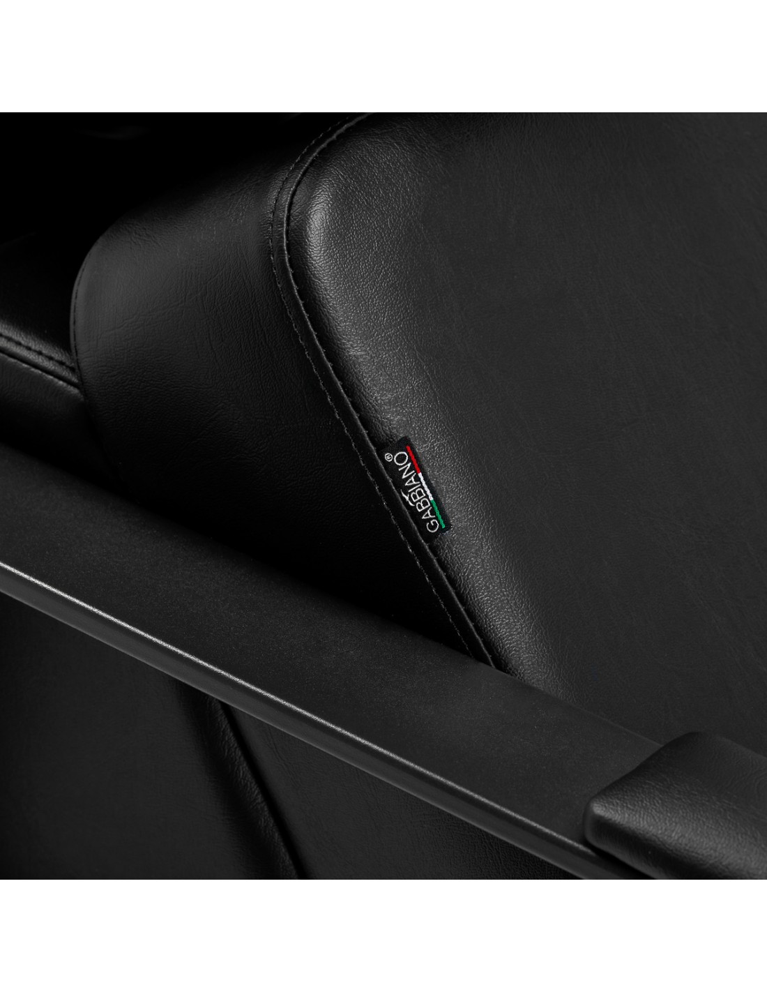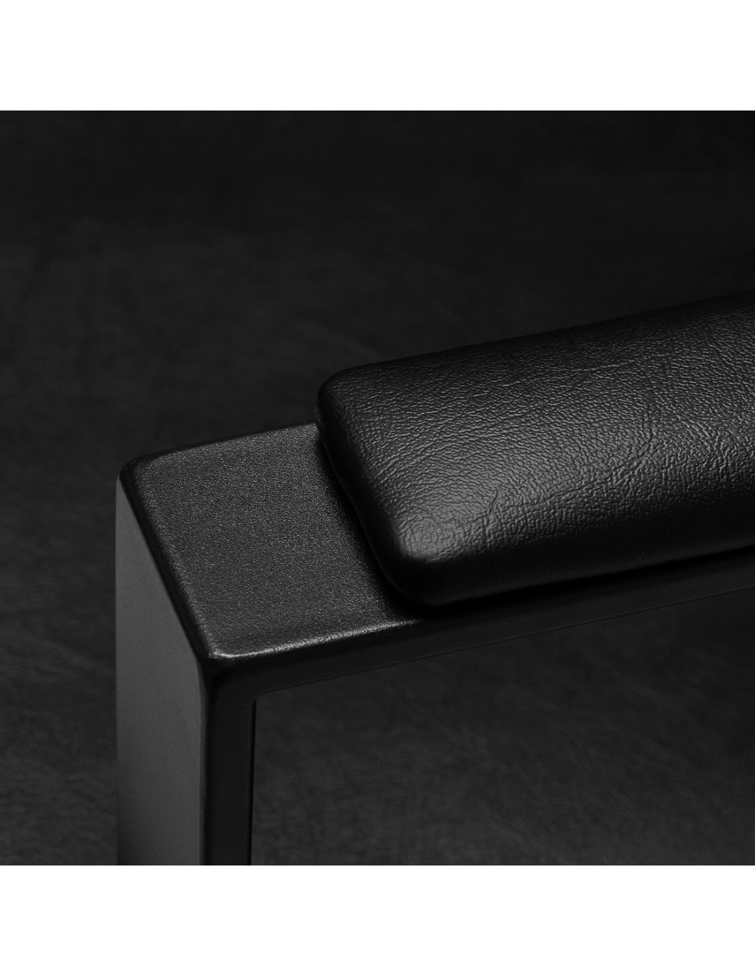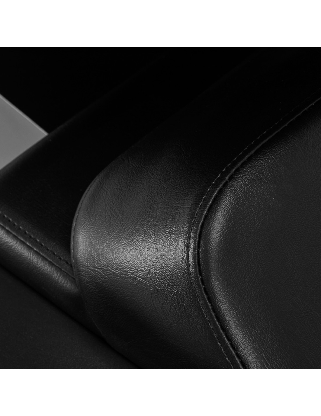 A properly profiled chair filled with durable foam ensures high comfort of use and geometric, partially upholstered armrests allow for correct positioning of the client's shoulders. The backrest is placed at an optimal angle and provides excellent support for the spine. Cover made of synthetic leather in shades of black guarantee long-term durability and ease of cleaning. The original, elegant look of wash adds interior's unique expression. Stabilization legs add stability and subtly emphasize the stylish character of the Salon washbasin unit. The set includes complete fittings with a matte finish in shades of black, including a faucet, shower head and dedicated hoses to provide a complete set of tools for work.