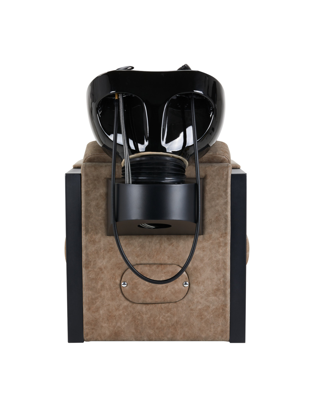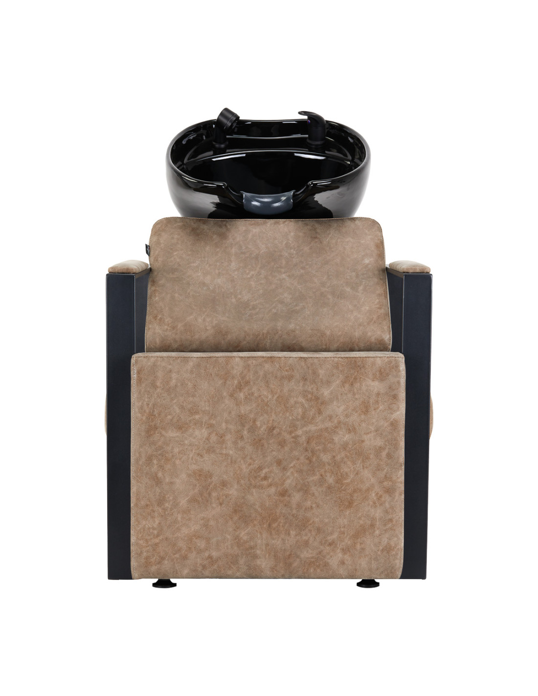 A properly profiled chair filled with durable foam ensures high comfort of use and geometric, partially upholstered armrests allow for correct positioning of the client's shoulders. The backrest is placed at an optimal angle and provides excellent support for the spine. Cover made of synthetic leather in shades of brown guarantees long-term durability and ease of cleaning. The original, elegant look of wash adds the interior's unique expression. Stabilization legs add stability and subtly emphasize the stylish character of the Salon washbasin unit. The set includes complete fittings with a matte finish in shades of black, including a faucet, shower head and dedicated hoses to provide a complete set of tools for work.