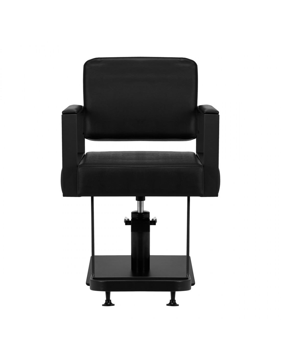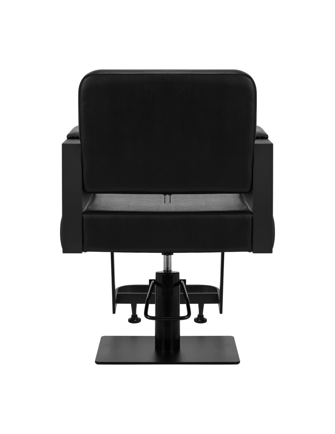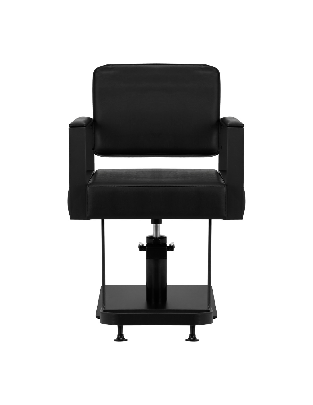 Equipping the chair with a full rotation mechanism makes the hairdresser's work more effective and comfortable. The solid, flat, square-shaped base guarantees stability during use. The matte-finished, smooth surface gives the element an elegant look and makes it easy to keep clean. A comfortable seat with foam filling ensures high comfort of use, even during many hours of treatments. Geometric, partially upholstered armrests allow for the correct positioning of the client's shoulders – this means that he does not bury his head in his shoulders or slouch – clearly making it easier to perform precise treatments, including haircuts.
