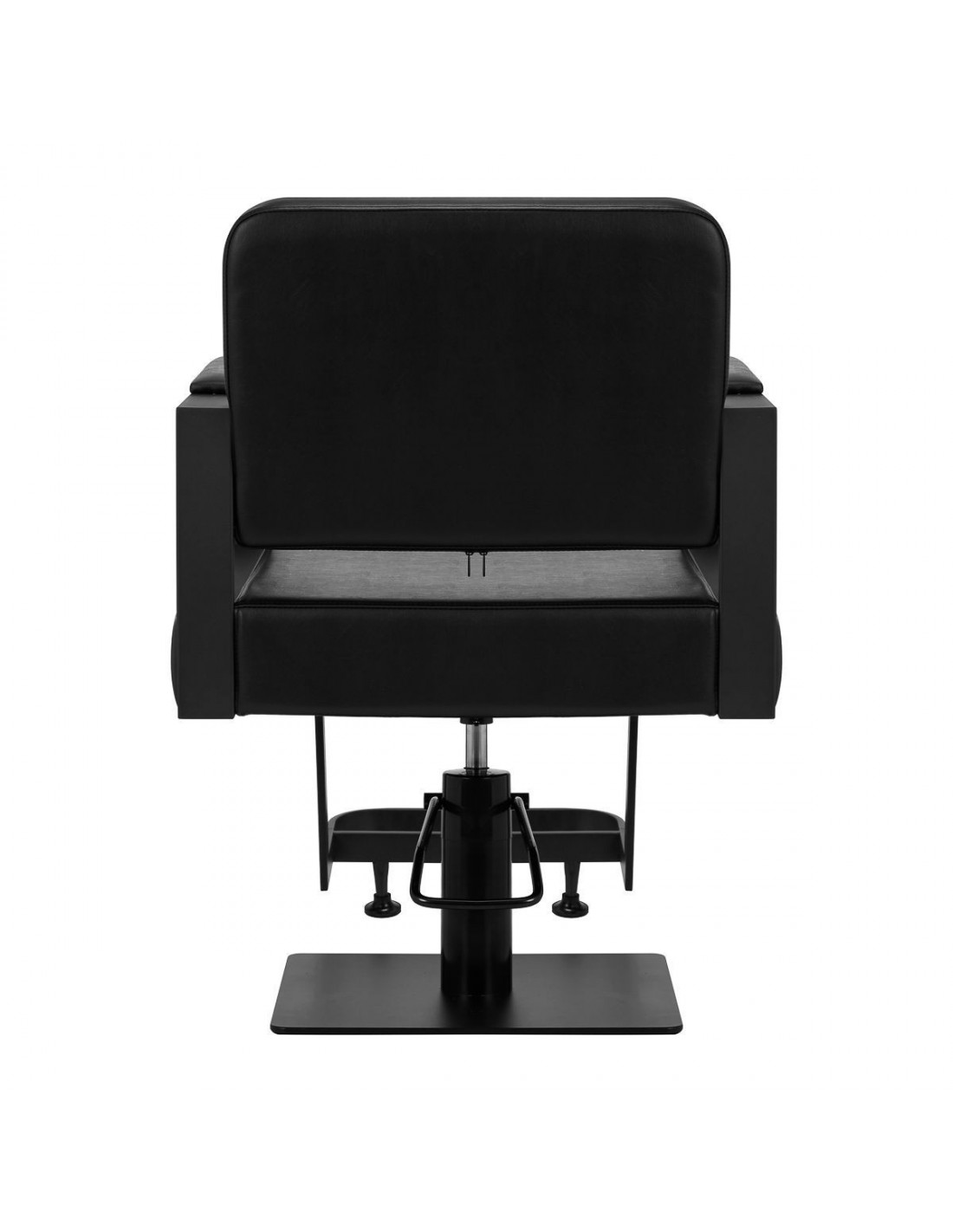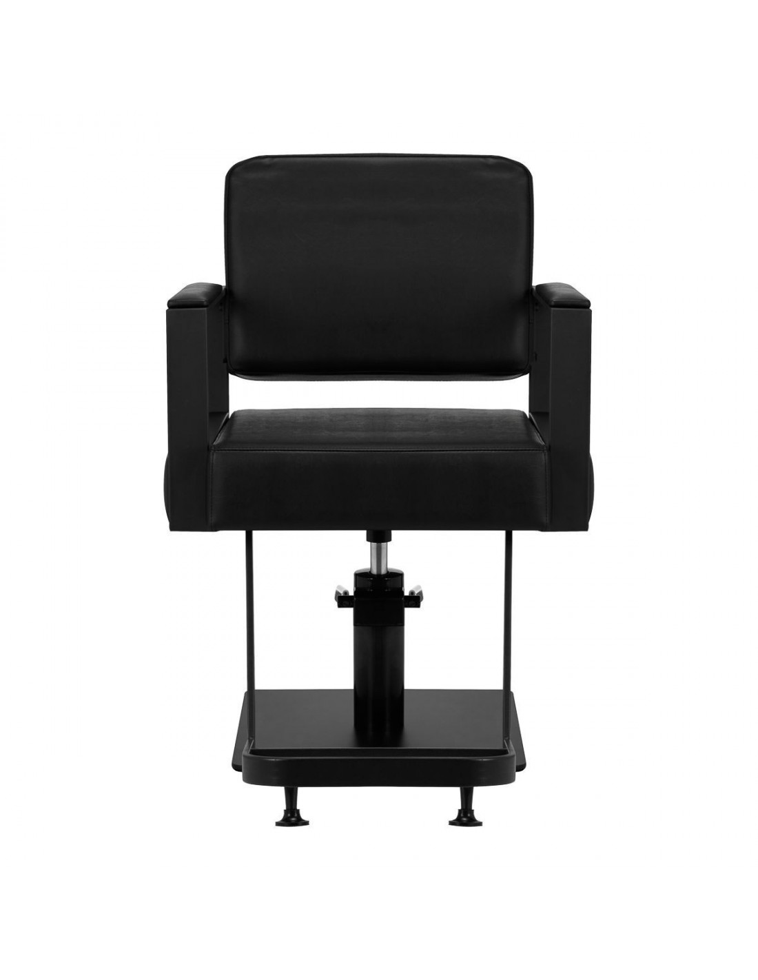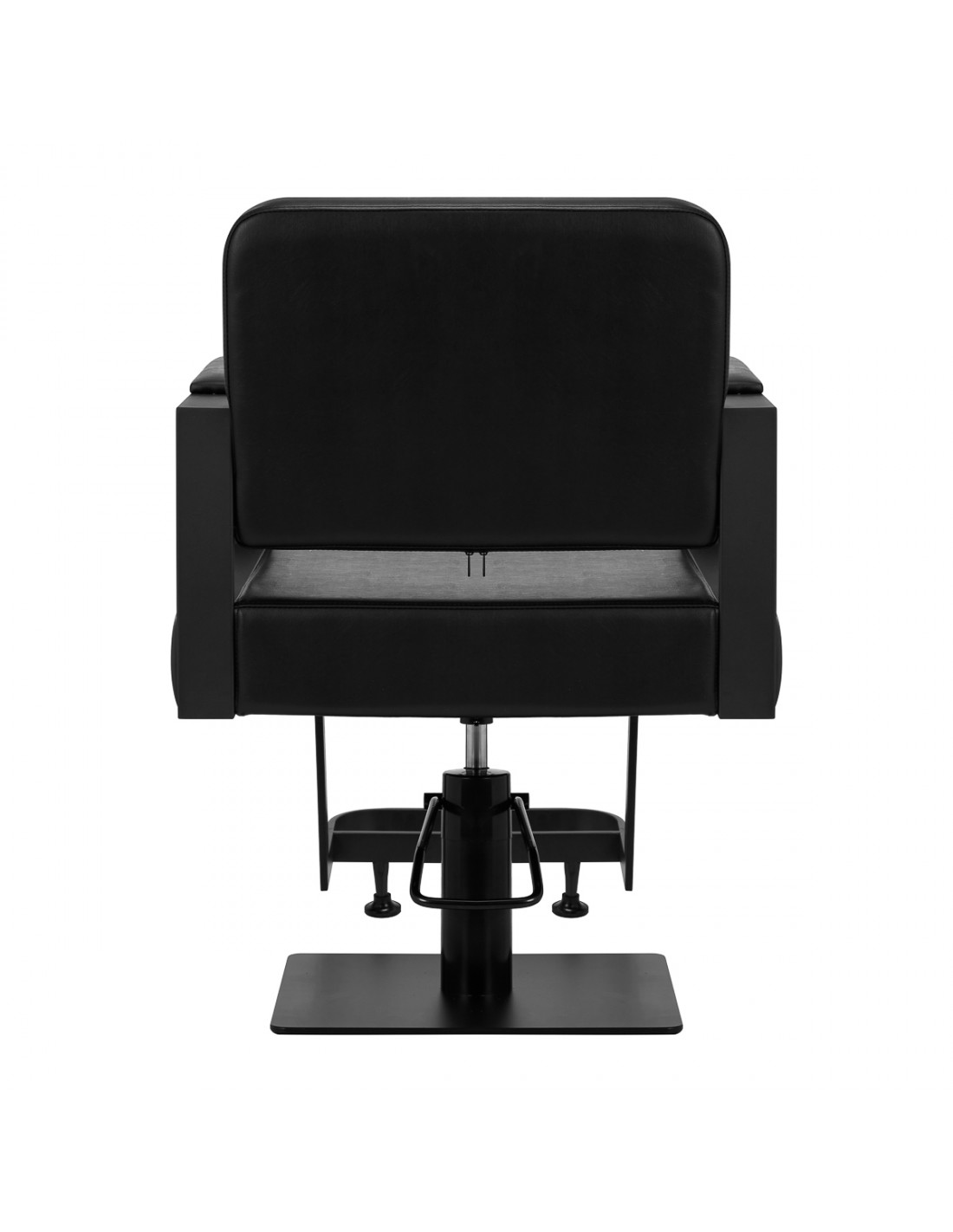 Equipping the chair with a full rotation mechanism makes the hairdresser's work more effective and comfortable. The solid, flat, square-shaped base guarantees stability during use. The matte-finished, smooth surface gives the element an elegant look and makes it easy to keep clean. A comfortable seat with foam filling ensures high comfort of use, even during many hours of treatments. Geometric, partially upholstered armrests allow for the correct positioning of the client's shoulders – this means that he does not bury his head in his shoulders or slouch – clearly making it easier to perform precise treatments, including haircuts.
