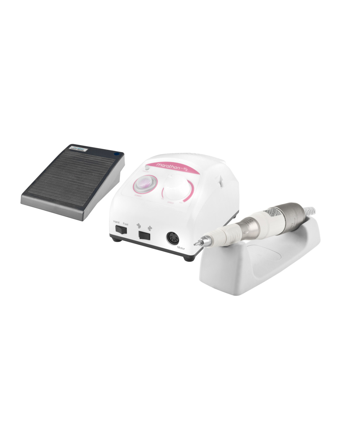 - The set includes: handpiece, control box, foot pedal, handpiece stand, handpiece holder, extra brushes, manual.