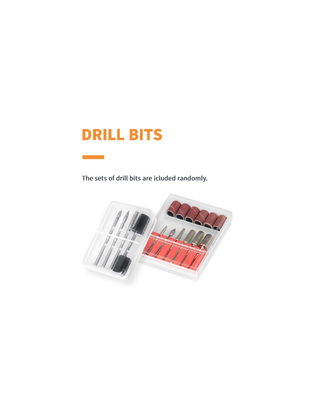A set of bits is included in the box. Thanks to this, you will be able to start practicing with the nail drill machine immediately and learn how to operate it. We also attach a handpiece stand which will allow you to protect it against falling during the break. In addition to a random set of bits, you also get a set of DBD-F bits. These are typical podiatry bits. They can also be used for cleaning nails from the bottom, removing calloused nail shafts, as well as for filing gel and acrylic nails.