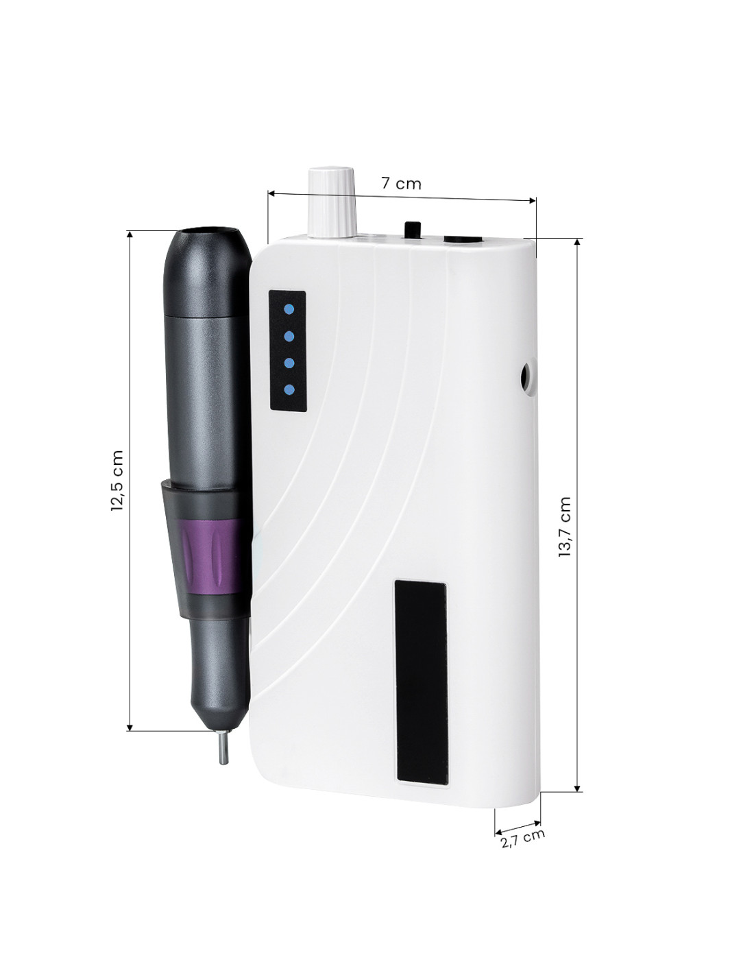 The efficient 2,000 mAh dual-focus rechargeable battery, that the device is equipped with, allows for continuous operation for up to 8-10 hours on a single charge. The nail drill operates relatively quietly, which allows comfortable work without irritating noises. This is important both for the person performing the treatment and for the comfort of the clients. While working, the head can be safely hung up thanks to a convenient plastic handle that can be mounted on the side of the device. The kit includes a set of diamond nail drill bits, a carrier and abrasive bands, which ensures versatility of use and facilitates the performance of various treatments.