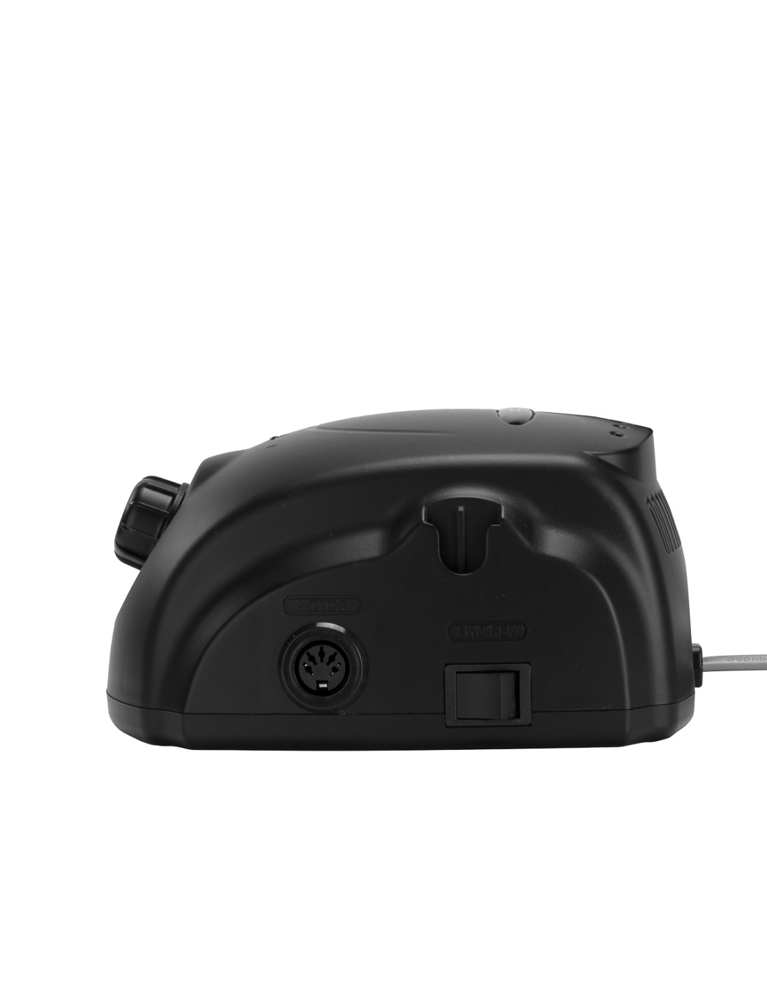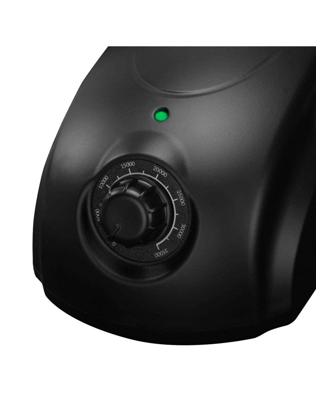 The nail drill is equipped with a knob with a scale for smooth speed adjustment from 5,000 to 35,000 rpm. A green LED indicates the device is ready for operation. The CLICK system prevents the knob from being under-tightened – a characteristic click confirms the correct setting, protecting the motor from overload and extending the device's lifespan. Switches located on the side of the housing allow you to change the rotation direction.