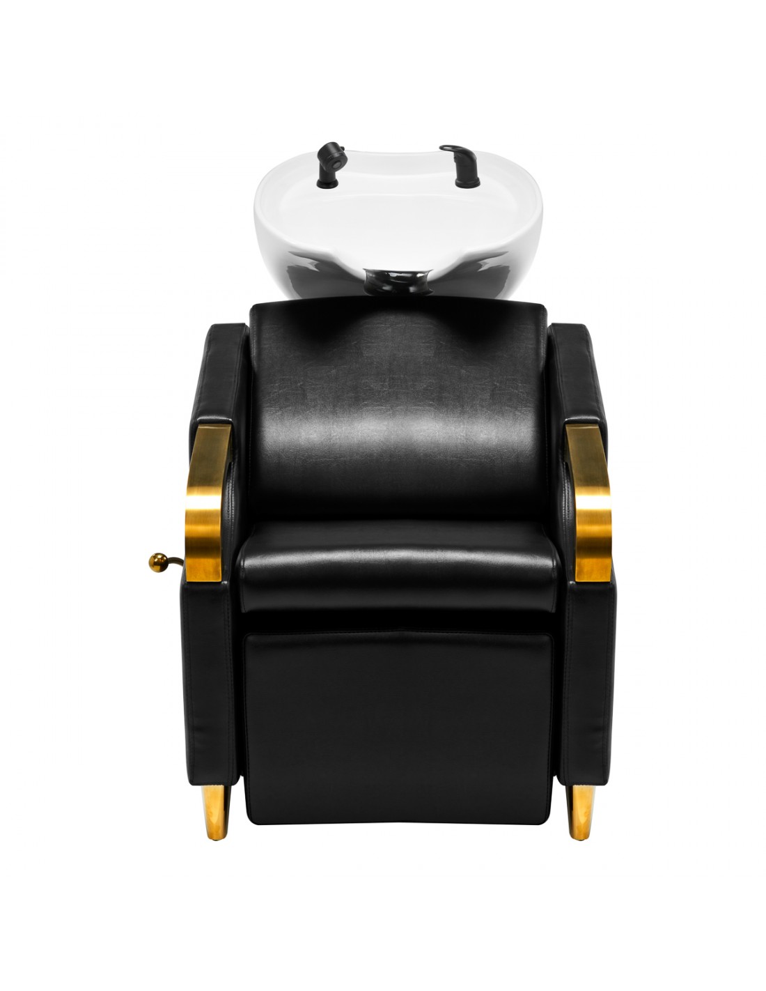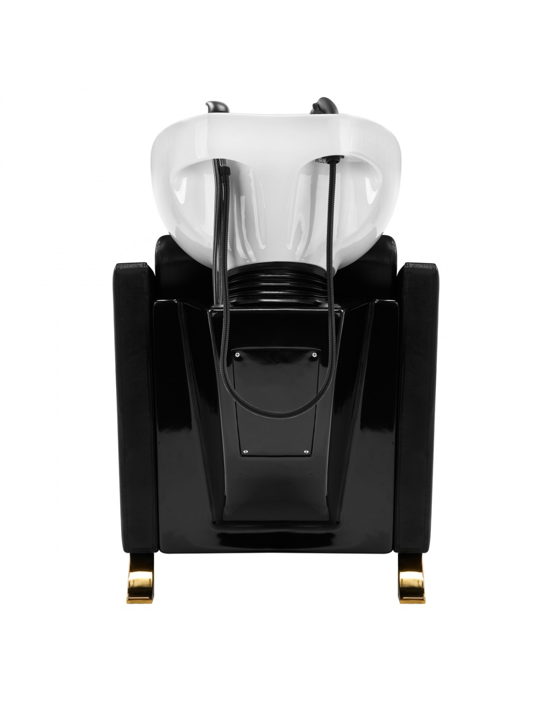 The contoured chair filled with durable foam provides adequate lumbar support and, therefore, high comfort of use. Armrests with elements in shades of gold allow for the correct positioning of the customer's shoulders. The pleasant-to-the-touch synthetic leather cover in shades of black ensures long-term durability and ease of cleaning. The elegant appearance of the hair wash unit gives the interior a unique expression. The legs and lever in shades of gold add stability and subtly emphasize the stylish character of the hair wash unit. The set includes complete fittings in shades of black, including a faucet, a shower handset and dedicated hoses to provide a complete set of tools for hairdresser’s work.