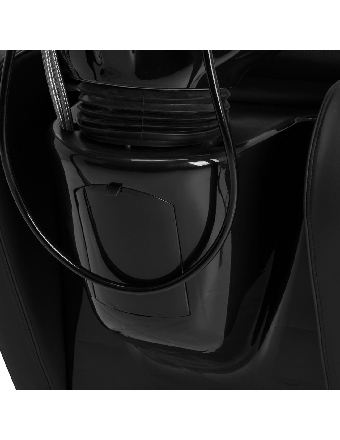 The depth of the ceramic washbasin bowl in shades of black allows for comfortable and efficient performance of a wide range of hairdressing services, preventing excessive splashing of water and products used during the treatment. The material used makes the washbasin durable, resistant to discoloration and scratches, and very easy to keep clean. The appropriately profiled collar and inclined backrest provide support and comfort while washing hair, and thanks to the comfortable plastic overlay in shades of black, the client will not feel discomfort from the cold ceramic surface.