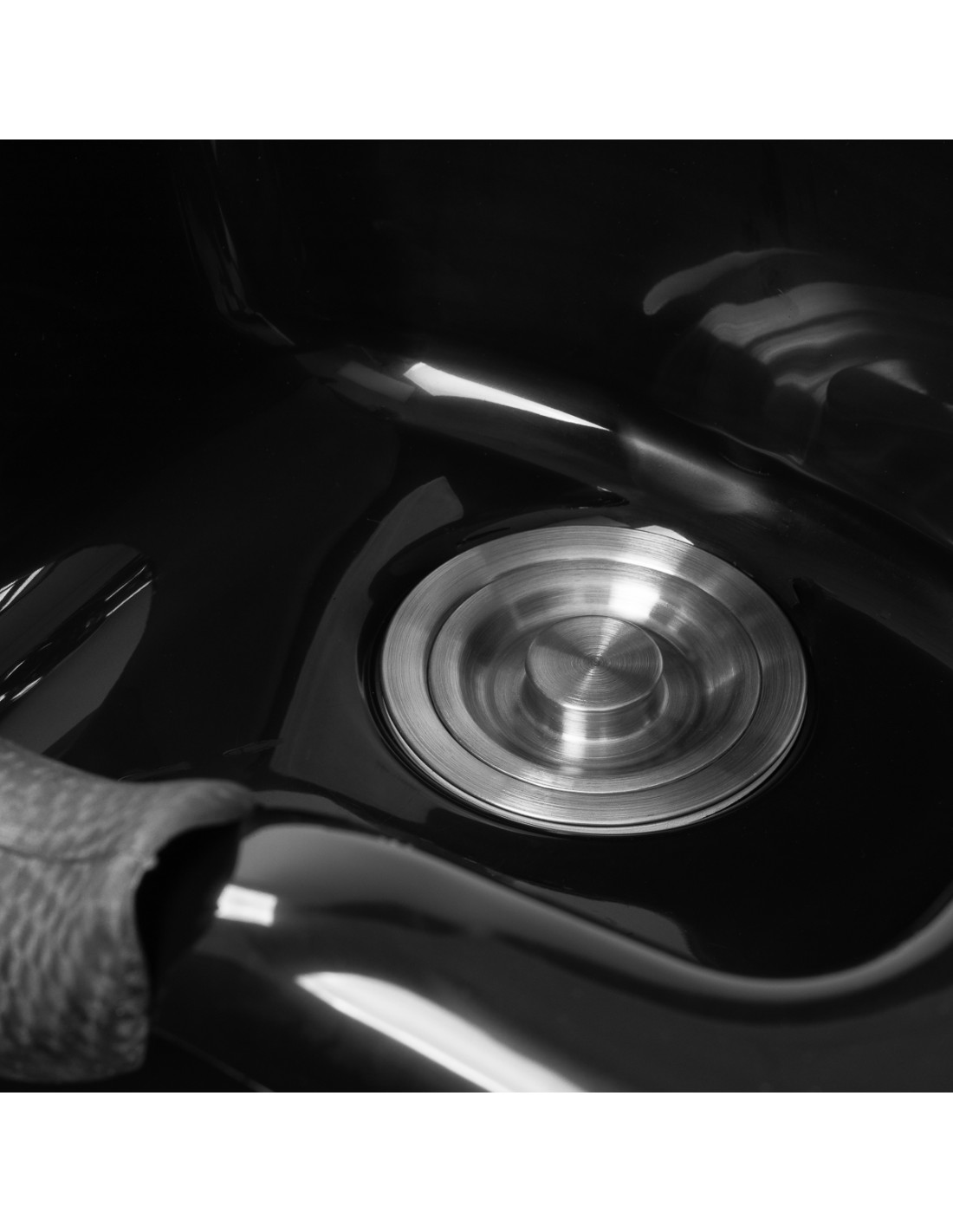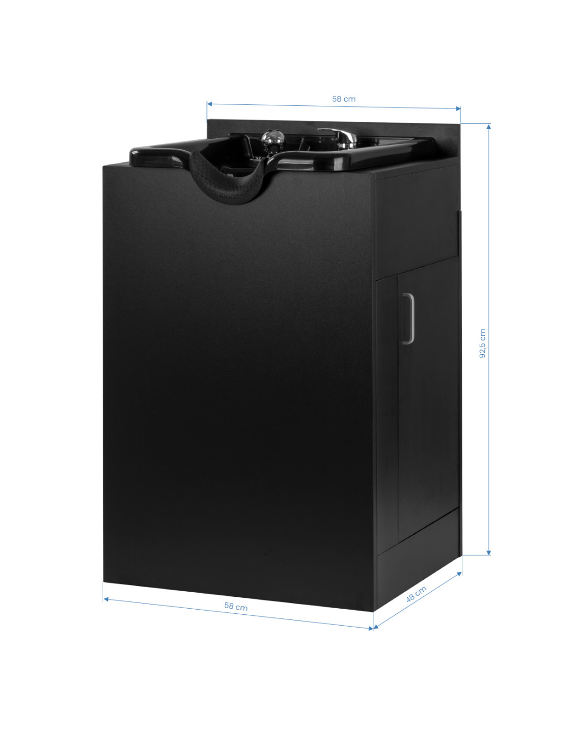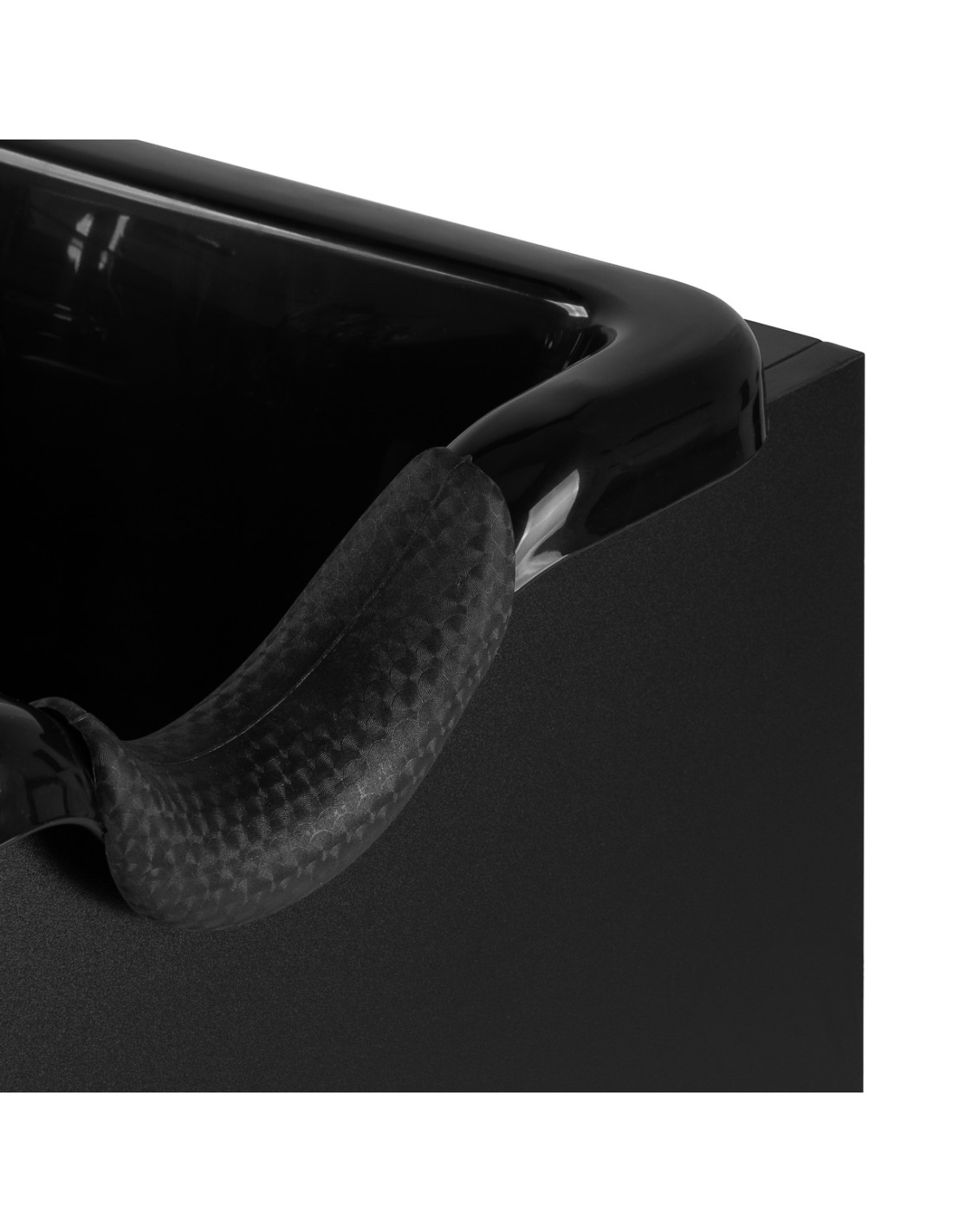 The deep black bowl is made of durable plastic, which makes it resistant to damage and easy to keep clean. Its well-thought-out design effectively reduces splashing of water and preparations during washing. The ergonomic shape and profiled collar with a silicone cover provide the client with a comfortable head position. A practical place for the shower handset helps to better organize the station, and the plug with a strainer makes it easier to control the water flow and maintain cleanliness and hygiene.